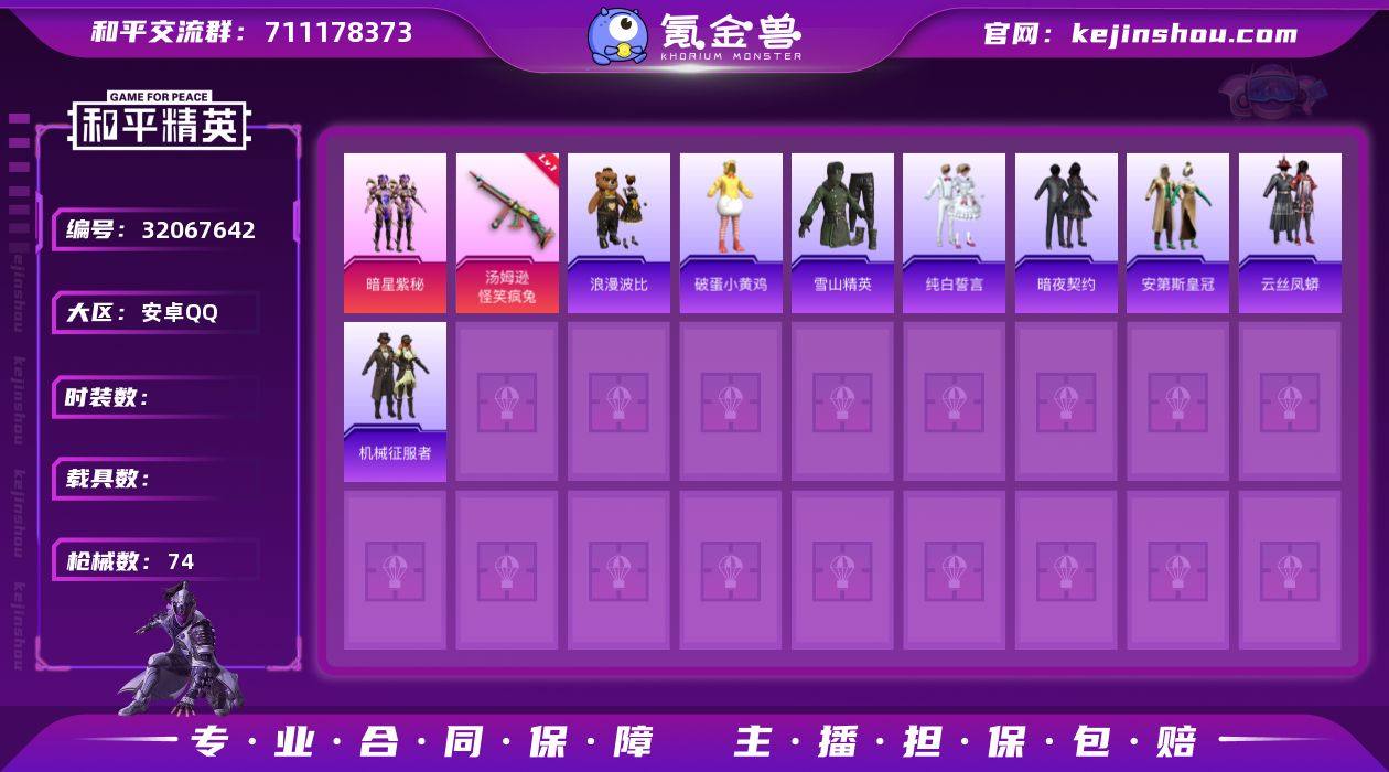 【kyhp747】安卓 手Q-1粉装-3特效枪-0载具-1粉色飞行器-21406热力值-2王牌印记-63套装-87枪皮 【热门品类】:套装-龟仙人 【粉色套装】:角色-虎痴许褚 【粉色枪皮等级】:Kar98K-巳巳如意(五级),Mk14-福马献瑞(五级),DP-28-豹影疾电(五级) 【粉色枪皮】:Kar98K-巳巳如意,Mk14-福马献瑞,DP-28-豹影疾电 【粉色飞行器】:炫彩糖果飞行器 【粉色降落伞】:垂柳戏鸭降落伞,喜羊羊与灰太狼降落伞,炫彩糖果降落伞 【稀有套装】:套装-龟仙人,套装-巳巳如意,套装-炫彩糖果,套装-马上来财,角色-绯色魅影 【稀有枪皮】:AUG-冰晶雪宝,AKM-龙的传人,SCAR-L-夜灯,SCAR-L-炫彩节奏,SCAR-L-玉兔迎春,M416-红色方程式,GROZA-影袭,AUG-天降萌叽,AUG-耀粉歌者,QBZ-彩虹符号,AC-VAL-天降萌叽,蜜獾-天降萌叽,UZI-天降萌叽,UZI-影袭,UZI-红色方程式,UMP45-夜灯,UMP45-春暖花开,UMP45-蓝色火焰,Vector-彩虹符号,汤姆逊-炫彩节奏,P90-巳巳如意,Kar98K-梦幻火箭,Kar98K-红色方程式,SKS-炫彩节奏,Mini14-耀粉歌者,S686-彩虹符号,S686-红色方程式,S686-巳巳如意,S12K-玩趣呆呆,S12K-破晓战魂,S12K-垂柳戏鸭,S12K-夜灯,S12K-幻世战舞者,DBS-彩虹符号,M249-破晓战魂,DP-28-彩虹符号,MG3-幻世战舞者,破片手榴弹-巳巳如意 【其他套装】:套装-SS20特训,套装-SS21特训,套装-SS25特训,套装-SS27特训,套装-SS28特训,套装-SS29特训,套装-冷焰舞者,套装-幻世战舞者,套装-幻影武者,套装-战地督导,套装-旭日情侣,套装-海岛探路者,套装-深蓝色名流,套装-湖蓝色名流,套装-灼焰舞者,套装-牛气满满,套装-特战装甲,套装-特训学院,套装-猎鹰,套装-猛禽,套装-玉兔迎春,套装-甜蜜告白,套装-白色伏地魔,套装-破晓战魂,套装-竞技名士,套装-红色运动,套装-耀粉歌者,套装-蓝色运动,...