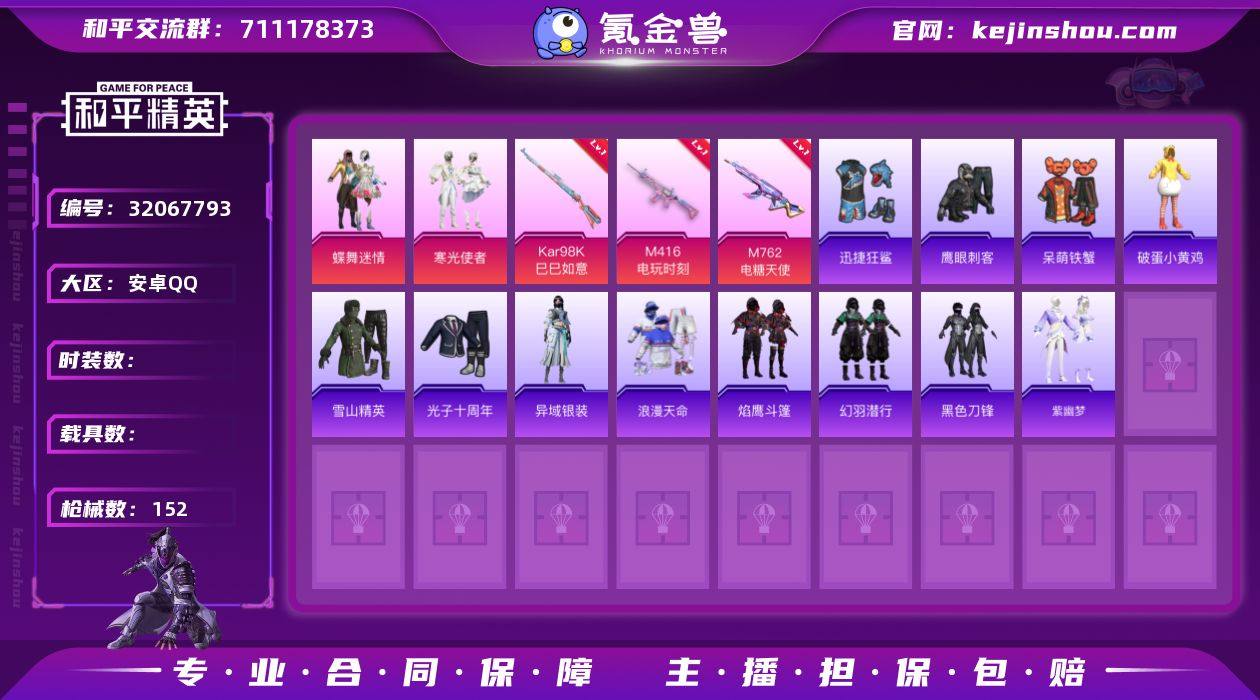 安卓 手Q-5粉装-4特效枪-1载具-30110热力值-2印记-51套装-90枪皮 【稀有载具】:鬼马风驰,僚机-萌兔起飞 【特效枪等级】:SCAR-L-锦绣绵绵(五级),M762-鬼刀(四级),Kar98K-未来歌姬(四级),Kar98K-巳巳如意(一级) 【优质套装】:角色-呆萌星弥,角色-美雪,角色-光极星,粉装-金丰海韵,角色-女娲灵识 【稀有套装】:套装-龟仙人,套装-雏菊兔兔,套装-萝兰蝴蝶,角色-拉斐尔,套装-糖糖葫芦,套装-青团波波,角色-都市丽猫,套装-燕燕于飞,套装-鱼渊荷华 【优质武器皮肤】:SCAR-L-锦绣绵绵,M762-鬼刀,Kar98K-未来歌姬,Kar98K-巳巳如意 【稀有武器皮肤】:AKM-江南烟雨,SCAR-L-红色方程式,M416-红色方程式,AUG-天降萌叽,QBZ-彩虹符号,QBZ-未来歌姬,M762-暗夜鎏金,G36C-镜域双华,AC-VAL-快闪甜心,蜜獾-天降萌叽,UZI-天降萌叽,UMP45-蓝色火焰,Vector-焰鹰斗篷,Vector-生命誓言,Vector-创世·救赎,汤姆逊-暗夜鎏金,汤姆逊-耀粉歌者,MP5K-怪笑疯兔,P90-快闪甜心,AWM-焰鹰斗篷,SKS-未来歌姬,Win94-怪笑疯兔,M417-惊鸿侠骨,MK20-H-快闪甜心,M200-惊鸿侠骨,S12K-玩趣呆呆,DBS-焰鹰斗篷,DP-28-焰鹰斗篷,MG3-镜域双华,MG3-惊鸿侠骨,沙漠之鹰-快闪甜心,TMP-9-江南烟雨,TMP-9-未来歌姬,TMP-9-雪月幻音,战术弩-江南烟雨,爆炸猎弓-天星战神,爆炸猎弓-惊鸿侠骨,大砍刀-鬼刀 【其他套装】:套装-SS24特训,套装-SS25特训,套装-SS26特训,套装-SS27特训,套装-SS28特训,套装-海岛探路者,套装-白色伏地魔,套装-破蛋小黄鸡,套装-竞技名士,套装-粉红小猪,套装-缤纷果语,套装-长空猛禽,套装-青玉碎影,套装-黑色伏地魔,套装-龟仙人,套装-贵族骑装,套装-诡面顽熊,套装-绚烂繁星,套装-绝对偶像,套装-惊鸿侠骨,套装-锦衣飞扬,套装-快闪甜心,套装-春光漫游,套装-贝斯之夜,...