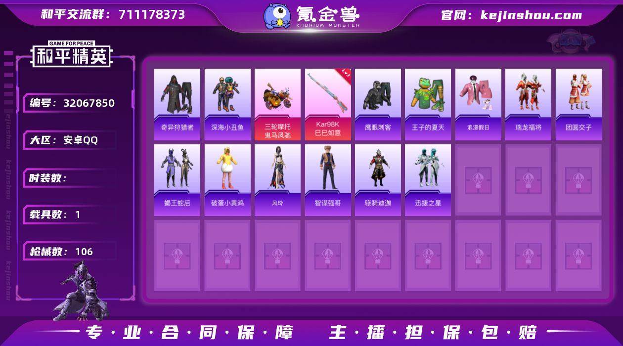 DSH2321【身法号1载具-2特效枪奇异狩猎者,深海小丑鱼 带暗区5.1m仓库价值 武器工兵铲,开山刀,涂鸦利刃,寒牙手刺,1金枪】 安卓手Q-1载具-2特效枪-98套装-106枪皮-2王牌印记-英勇黄金Ⅱ-31875热力值【1载具】鬼马风驰【2特效枪】DP-28-豹影疾电[5级],Kar98K-巳巳如意[5级]【3稀有】奇异狩猎者,深海小丑鱼,M762-奇异狩猎者【1飞行器】粉色滑翔尾迹【2头盔】马卡龙头盔,深海小丑鱼头盔【199其它衣服和枪皮】SS19特训,猛禽,龙腾端午,幻世战舞者,SS34特训,魅力单车,战术大师,银白舞王,元气之梦,猎鹰,完美偶像,竞技达人朋克,破蛋小黄鸡,牛气满满,SS12特训,灼焰舞者,飞行日记,竞技名士,幻影武者,极速红龙,SS27特训,滨海假日,鹤鸣,绮丽涂鸦,滨海厨神,虎虎生威吉莉,萌鸡速递,黄色伏地魔,蝎王蛇后,SS21特训,湖蓝色名流,白色伏地魔,深蓝色名流,冷焰舞者,潮流先锋,SS22特训,SS17特训,特训学院,冰川特警,长空猛禽,元素星魂,角色-英勇保护者,SS13特训,青年教官,橘黑制服,贵族骑装,海上生明月,鹰眼刺客,酒红色名流,龙的传人,破晓战魂,治愈之星,都市魅力,王子的夏天,镭射皇者,SS14特训,星河入梦,SS15特训,蓝彩潮人,青春冒险家,特战装甲,红色运动,萌黄之夏,瑞龙福将,黑色伏地魔,特种颜团子,冰爽海盐,冰河战士,科技之星,弄潮海豚,潮流游乐家,迅捷之星,玉兔迎春,浪漫假日,SS23特训,SS25特训,黄色运动,萌趣颜团子,阳光火鸡,智谋强哥,团圆交子,SS16特训,骁骑迪迦,蓝色运动,街头潮人,白糯汤圆,霸义无双,麻辣教官,角色-风玲,人气偶像,战地督导,黄色名流,SS20特训,耀粉歌者,福星高照,耀眼新星,SCAR-L-红色方程式,QBU-青春冒险家,Kar98K-红色方程式,AUG-天降萌叽,S12K-幻世战舞者,GROZA-海盐豹豹,AKS-74U-鬼刀,QBZ-赛罗,Win94-瑞龙福将,M416-红色方程式,UZI-炫彩节奏,蜜獾-天降萌叽,MG3-幻世战舞者,汤姆逊-