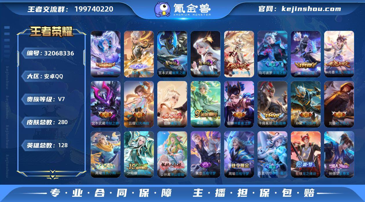 W14834,,可立即换绑无需挂单养号,,,铭文满级,,,典藏1,,传说12,,,星传说3,,按键22,,,夺宝243,,安卓Q-V7-尊贵铂金III段位-128英雄-280皮肤-1典藏皮肤-1无双-12传说-62史诗 【英雄全皮】:孙权全皮,空空儿全皮,影全皮 【荣耀典藏】:貂蝉幻阙歌 【无双皮肤】:曜器灵螭龙剑 【传说皮肤】:澜愿照九州拓,云缨幻光神枪,桑启鸣野蒿,貂蝉曦玄引,孙尚香乘龙问璇玑,澜逐花归海,马可波罗深海之息,孙策末日机甲,刘备时之恋人,干将莫邪久胜战神,貂蝉仲夏夜之梦,宫本武藏地狱之眼 【限定皮肤】:大乔绒语心约,姜子牙天穹之誓,狄仁杰阴阳师,赵云皇家上将,孙尚香蔷薇恋人,庄周高山流水,高渐离玩趣恶龙,白起夜都怪侠,元歌云间偶戏,甄姬游园惊梦,马可波罗深海之息,狄仁杰魔术师,达摩沙漠行僧,项羽海滩派对,王昭君午后时光,兰陵王金庭之子,孙悟空至尊宝,李元芳云中旅人,干将莫邪胡桃夹子,鬼谷子五谷丰年,铠青龙志,百里玄策原初追逐者,沈梦溪大漠名商,明世隐吟游魔法,裴擒虎擒涛扼浪,狂铁电玩高手,云中君纤云弄巧,嫦娥拒霜思,嫦娥暖冬兔眠,鲁班大师探海日志,桑启海盐诗旅,暃星界游侠,阿古朵江河有灵,张良古海寻踪,鬼谷子天穹祈灯,孙尚香乘龙问璇玑,貂蝉曦玄引,沈梦溪龙舞盛年,刘邦剑破天穹,上官婉儿群星魔术团,程咬金群星魔术团,刘备异域游侠,周瑜熔金海岸 【年限皮肤】:铠青龙志,孙尚香乘龙问璇玑,澜愿照九州拓 【赛季限定】:达摩沙漠行僧,兰陵王金庭之子,沈梦溪大漠名商,李元芳云中旅人,桑启海盐诗旅,裴擒虎擒涛扼浪,鲁班大师探海日志,张良古海寻踪,鬼谷子天穹祈灯,刘邦剑破天穹,姜子牙天穹之誓,东皇太一噬灭天穹,太乙真人谧流熔炉,钟馗虚灵犬护,甄姬逆浪荇歌,亚瑟荣光之誓,百里玄策原初追逐者 【战令限定】:元歌云间偶戏,明世...
