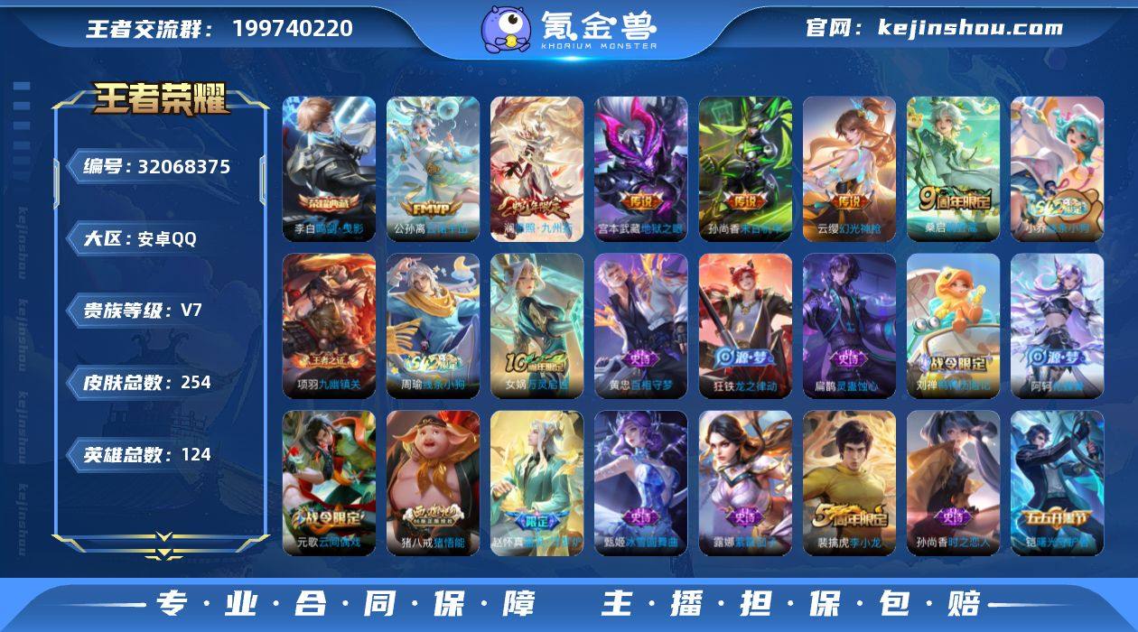 实名: 可修改 性别: 女号 贵族等级: V7 英雄数: 124 皮肤数: 254 荣耀水晶: 鸣剑·曳影 传说皮: 末日机甲-孙尚香,地狱之眼,幻光神枪,云诺千山 限定皮: 遇见飞天,李小龙,梁祝,猪悟能,五谷丰年,鸣野蒿,愿照·九州拓 亮点: 【优质装备】:鸣剑·曳影,末日机甲-孙尚香(绿蚂蚱),地狱之眼