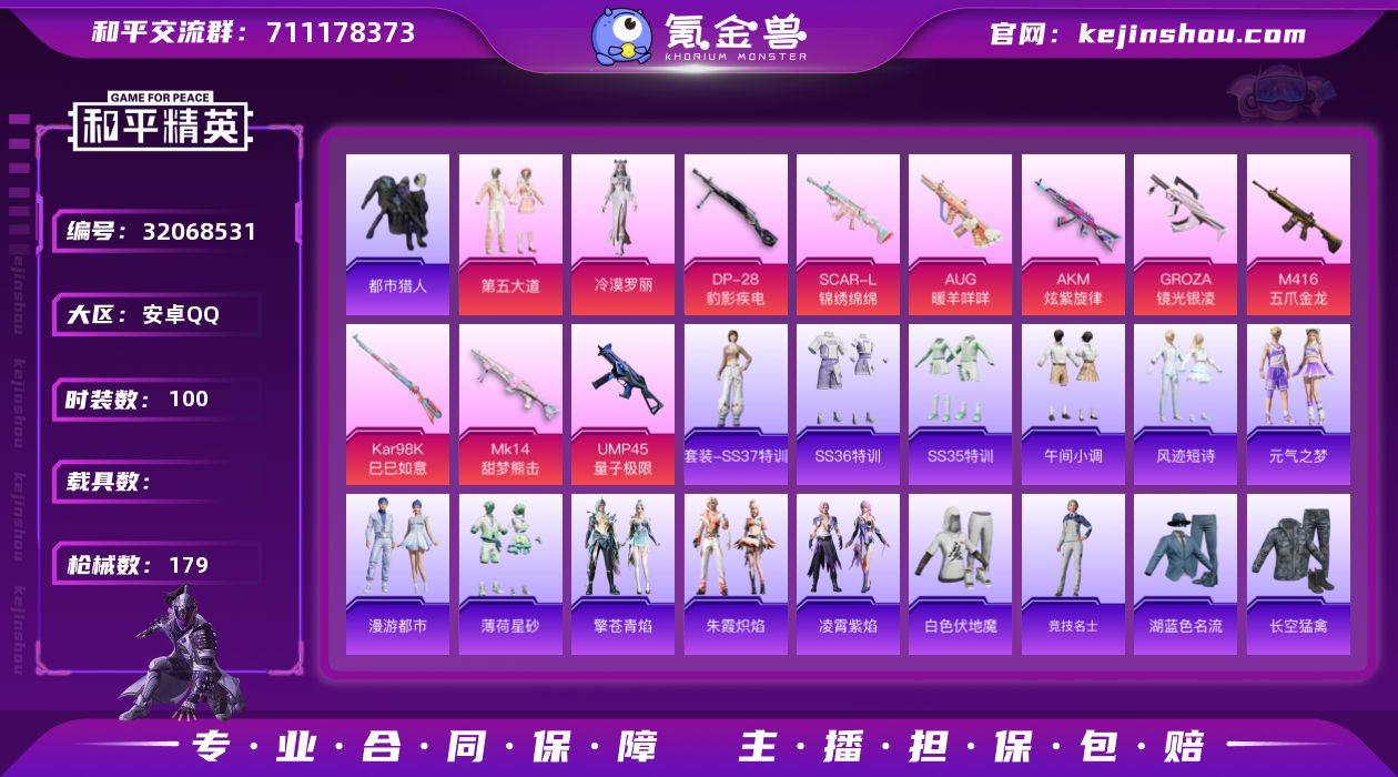 【0载具 9特效枪 2粉装 179枪皮 100套装】11王牌1卓越1传奇 热力值5.2w 都市猎人,浪漫天命,第五大道,冷漠罗丽 ,AUG-暖羊咩咩5级,AKM-炫紫旋律7级,M416-五爪金龙7级,Kar98K-巳巳如意,Mk14-甜梦熊击,UMP45-量子极限,DP-28-豹影疾电 SCAR-L-锦绣绵绵 异域银装飞行器,冰柠泡泡飞行器,鸡智如我飞行器,炫彩糖果飞行器,编号:QNZWZ85