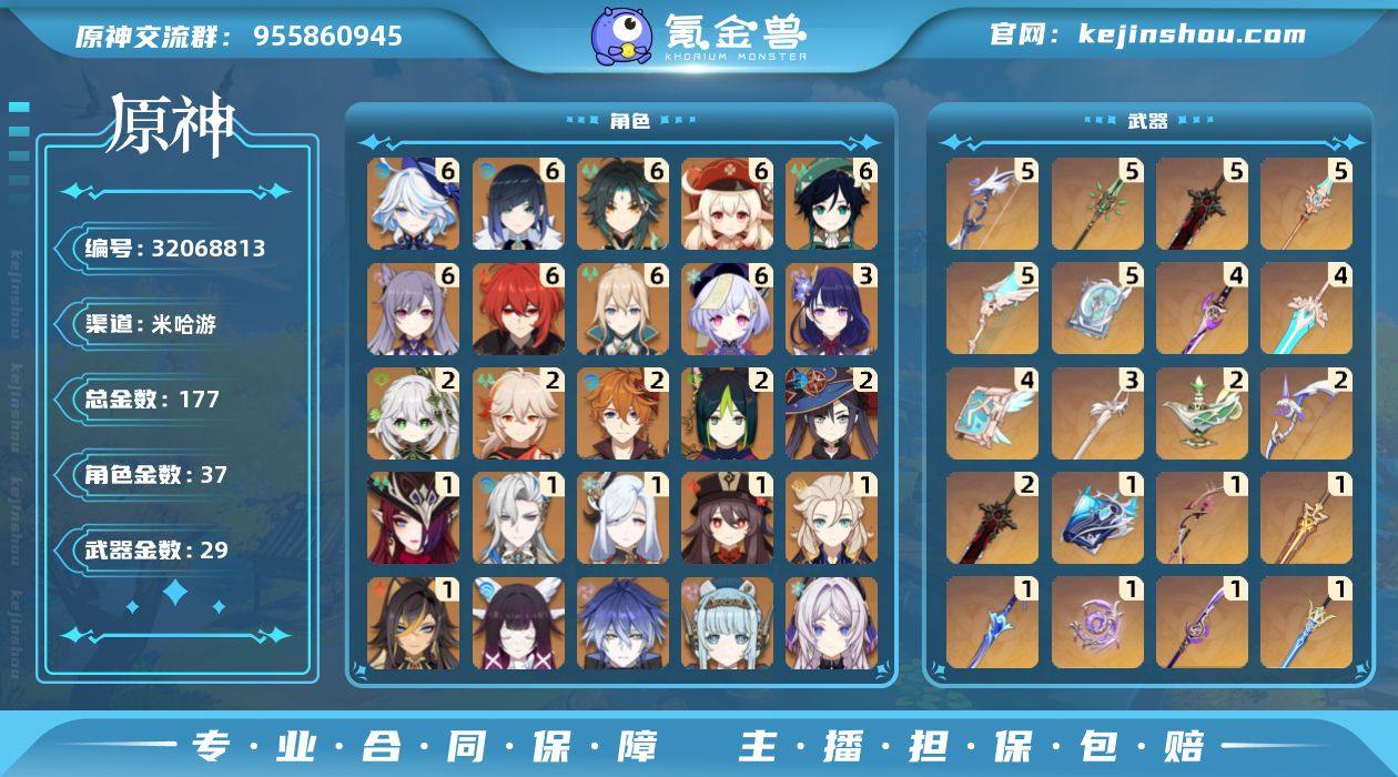 冒险等级:60 总黄数:177 5星角色数:37 5星武器数:29 原石数量:7079 相遇之缘数量:0 纠缠之源数量:44 6命芙宁娜,6命夜兰,6命魈,6命可莉,6命温迪,6命刻晴,6命迪卢克,6命琴,6命七七,3命雷电将军,2命纳西妲,2命枫原万叶,2命达达利亚,2命提纳里,2命莫娜,1命恰斯卡,1命那维莱特,1命申鹤,1命胡桃,1命阿贝多,1命迪希雅,0命哥伦比娅,0命菲林斯,0命伊涅芙,0命茜特菈莉,0命希诺宁,0命白术,0命流浪者,0命妮露,0命神里绫人,0命荒泷一斗,0命珊瑚宫心海,0命宵宫,0命神里绫华,0命优菈,0命甘雨,0命钟离 6命班尼特,6命嘉明,6命香菱,6命行秋,6命夏洛蒂,6命安柏,6命芭芭拉,6命北斗,6命重云,6命迪奥娜,6命珐露珊,6命菲谢尔,6命九条裟罗,6命凯亚,6命坎蒂丝,6命柯莱,6命雷泽,6命丽莎,6命罗莎莉亚,6命诺艾尔,6命凝光,6命砂糖,6命托马,6命五郎,6命辛焱,6命烟绯,6命瑶瑶,6命云堇,5命早柚,4命菲米尼,4命久岐忍,4命卡齐娜,4命多莉,4命莱依拉,3命绮良良,3命鹿野院平藏,2命琳妮特,2命赛索斯,1命雅珂达,1命欧洛伦,1命米卡,0命爱诺,0命蓝砚,0命夏沃蕾,0命伊安珊,0命伊法,0命卡维,0命埃洛伊 精5若水,精5和璞鸢,精5狼的末路,精5天空之脊,精5天空之翼,精5四风原典,精4雾切之回光,精4天空之傲,精4天空之卷,精3风鹰剑,精2千夜浮梦,精2阿莫斯之弓,精1万世流涌大典,精1最初的大魔术,精1圣显之钥,精1波乱月白经津,精1不灭月华,精1薙草之稻光,精1苍古自由之誓,精1松籁响起之时,精1护摩之杖,精1冬极白星,精1终末嗟叹之诗,精1磐岩结绿,精1天空之刃 100%侦察骑士,古恩希尔德的传承,帆影游风,极夜真梦,倩影游侠,闪耀协奏,纱中幽兰,星与月之约,雨化竹身,叶隐芳名,致教会自由人 卖家说:新地图任务没做 活动也做做完还没有一百多抽 有月卡 开服老号资源多 满仓极品圣遗物