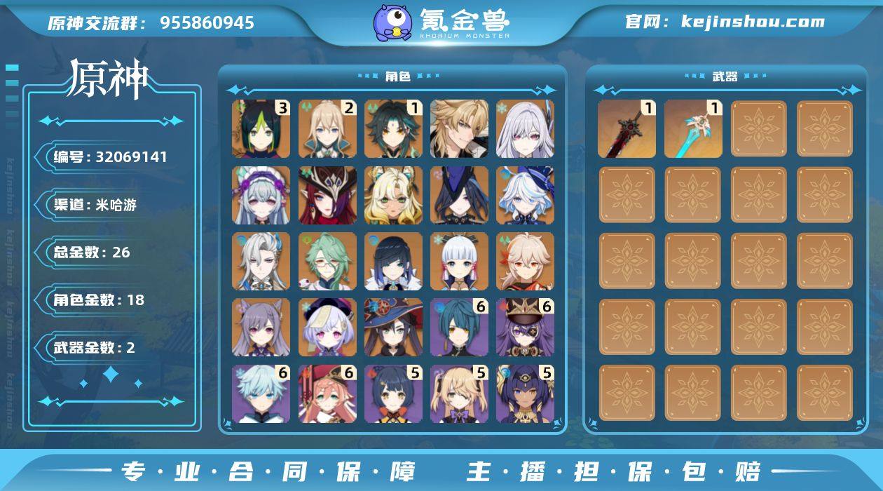 邮箱: 不送邮/死邮 总黄数: 26 冒险等级: 58 3命金色角色: 三命提纳里 2命金色角色: 二命琴 1命金色角色: 一命魈 0命金色角色: 枫原万叶,神里绫华,七七,刻晴,莫娜,夜兰,白术,那维莱特,芙宁娜,克洛琳德,希诺宁,恰斯卡,梦见月瑞希,丝柯克,法尔伽 拥有武器: 狼的末路,天空之刃 1精武器: 狼的末路,天空之刃