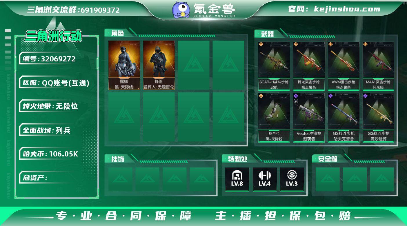+暗星-黑天际线.资产232M】【【无二次协助处理】z8922-特勤处:仓库8级/靶场3级/训练中心4级-232m总资产-106055k哈伏币-60烽火等级-铂金-19战场等级-列兵 【干员外观】:露娜-黑·天际线,蜂医-送葬人·无题密令,露娜-金牌射手 【近战皮肤】:近战-暗星,近战-黑鹰 【传说外观】:M4A1突击步枪-阿米娅,AKM突击步枪-锦绣,SG552突击步枪-运动员,SCAR-H战斗步枪-启航,G3战斗步枪-骑士,腾龙突击步枪-捞点薯条,腾龙突击步枪-马年祥瑞,腾龙突击步枪-万金泪冠,K437突击步枪-锦绣,47突击步枪-暗星,SMG-45冲锋枪-锦绣,SR-3M紧凑突击步枪-暗星,勇士冲锋枪-能天使-午夜邮差,勇士冲锋枪-万金泪冠,725双管霰弹枪-送葬人-无题密令,M14射手步枪-蛮荒,M14射手步枪-缄花,SR-25射手步枪-缄花,AWM狙击步枪-捞点薯条,AWM狙击步枪-万金泪冠,.357左轮-缄花,G18-马年祥瑞,93R-捞点薯条,复合弓-黑·天际线 【史诗外观】:Vector冲锋枪-潜袭者,QBZ95-1突击步枪-曙光,K416突击步枪-腊梅,K416突击步枪-阿萨拉特攻,M7战斗步枪-百步穿杨,SCAR-H战斗步枪-囚徒,G3战斗步枪-流沙送葬,G3战斗步枪-哈夫克警备,AS Val突击步枪-百步穿杨,腾龙突击步枪-无垢,MP5冲锋枪-深海恐惧,MP5冲锋枪-竞技风,Vector冲锋枪-阿萨拉文明,Vector冲锋枪-百步穿杨,SR-3M紧凑突击步枪-荒野求生,SR-3M紧凑突击步枪-开工大吉,勇士冲锋枪-丛影谍踪,MP7冲锋枪-无垢,MP7冲锋枪-六套之力,PKM通用机枪-荒野求生,M249轻机枪-丛影谍踪,M250通用机枪-囚徒,QJB201轻机枪-炽焰,VSS射手步枪-丛影谍踪,SVD狙击步枪-荒野求生,M14射手步枪-工业狂潮,PSG-1射手步枪-无垢,SV-98狙击步枪-林中猎手,M700狙击步枪-蝮蛇,M700狙击步枪-百步穿杨,AWM狙击步枪-流沙送葬 【稀有外观】:MP7冲锋枪-黑潮,