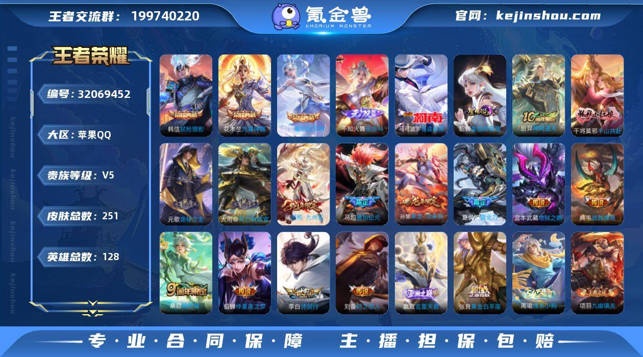 贵族等级:V5 典藏皮肤数:3 珍品无双皮肤数:0 无双皮肤数:1 珍品传说皮肤数:1 传说皮肤数:16 史诗皮肤数:93 皮肤数:251 英雄数:128 段位:星耀 卖家说:有不知火舞的花合斗,马可波罗的怪盗基德等等,退游了,不刀谢谢