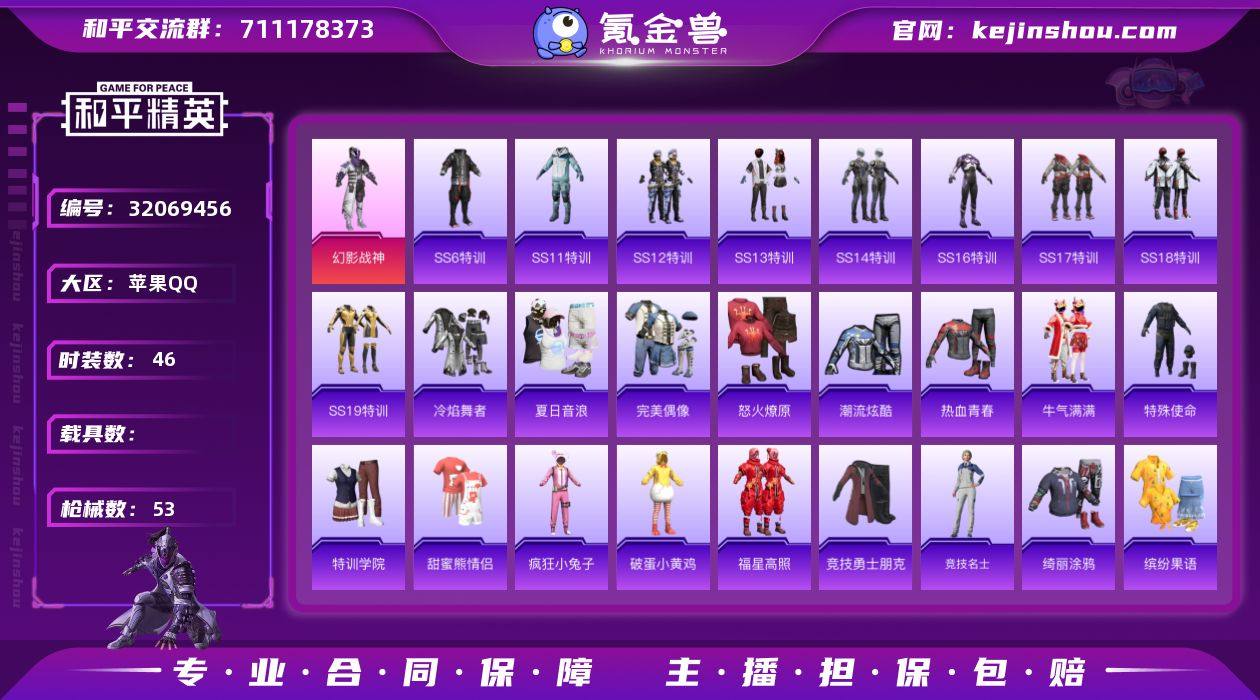 【FK6454】46套装/枪械1/装备30/战备38/王牌印记1/热力值14096/五级Mk14-福马献瑞/幻影战神/Mk14-福马献瑞/幻影战神降落伞/星穹咏叹调降落伞/套装-马上有钱/套装-雨过天青/套装-红釉青花/AKM-夜灯/AKM-生命誓言/AKM-破晓战魂/AKM-虎虎生威/SCAR-L-暗夜玫瑰/M416-红色方程式/M416-蓝色火焰/AUG-天降萌叽/AUG-耀粉歌者/QBZ-彩虹符号/M762-牛气冲天/G36C-星穹咏叹调/UZI-啾咪啾咪/UZI-影袭/UMP45-生命誓言/UMP45-蓝色火焰/Vector-彩虹符号/汤姆逊-幻影战神/野牛-夜灯/Kar98K-红色方程式/M24-影袭/Mini14-炫彩节奏/S12K-幻影战神/SS6特训/SS11特训/SS12特训/SS13特训/SS14特训/SS16特训/SS17特训/SS18特训/SS19特训/冷焰舞者/夏日音浪/完美偶像/怒火燎原/潮流炫酷/热血青春/牛气满满/特殊使命/特训学院/甜蜜熊情侣/疯狂小兔子/破蛋小黄鸡/福星高照/竞技勇士朋克/竞技名士/绮丽涂鸦/缤纷果语/虎虎生威吉莉/长空猛禽/骑行爱好者/漫步者/幻影公爵/雪山精英