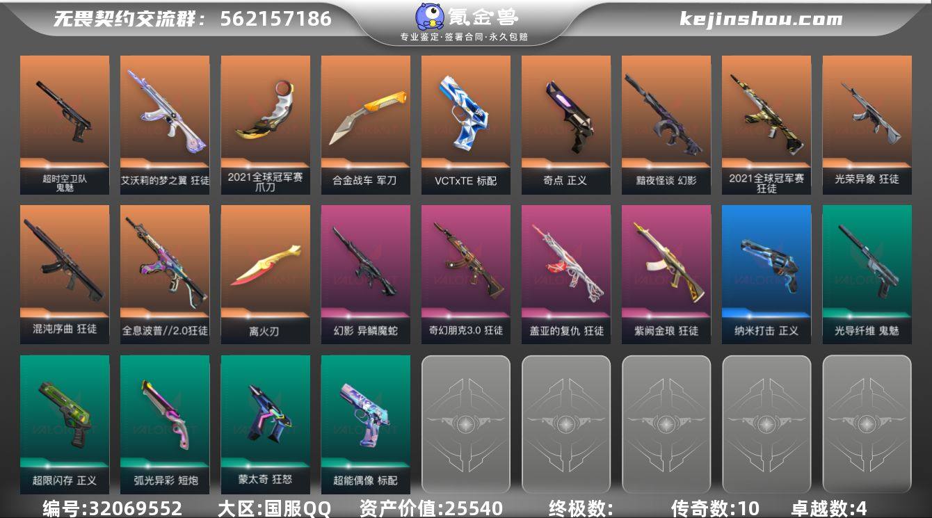 皮肤资产价值:25540 已用源晶点数:950 军刀-合金战车 爪刀-2021全球冠军赛 离火刃 幻影-黯夜怪谈,狂徒-艾沃莉的梦之翼,狂徒-2021全球冠军赛,光荣异象 狂徒,狂徒-混沌序曲,狂徒-全息波普//2.0,幻影 异鳞魔蛇,狂徒-奇幻朋克3.0,狂徒-盖亚的复仇,狂徒-紫阙金琅 标配-VCTxTE,超时空卫队 鬼魅,正义-奇点,标配-超能偶像,短炮-弧光异彩,鬼魅-光导纤维,蒙太奇 狂怒,正义-超限闪存,正义-纳米打击 孵化小能手:破壳鸭卡面,无畏契约GO!第一卷:捷风卡面,无畏契约GO!第一卷:零卡面,无畏契约GO!第一卷:芮娜卡面,看镜头卡面,离火刃凤卡面,离火刃凰卡面,梦幻奶茶卡面,情人节捷风卡面,热舞环节卡面,势不可挡零卡面,双城之战金克丝卡面,双城之战拥抱卡面,声感陷阱设计图卡面,铁之华卡面,无畏契约暮蝶卡面,艺无止境火焰卡面,艺无止境坚不可摧卡面,艺无止境灵感卡面,最高舞台卡面,终章:生意人麦宝卡面 卖家说:21冠军套,离火刃,神话挂饰,多赛季超凡挂饰