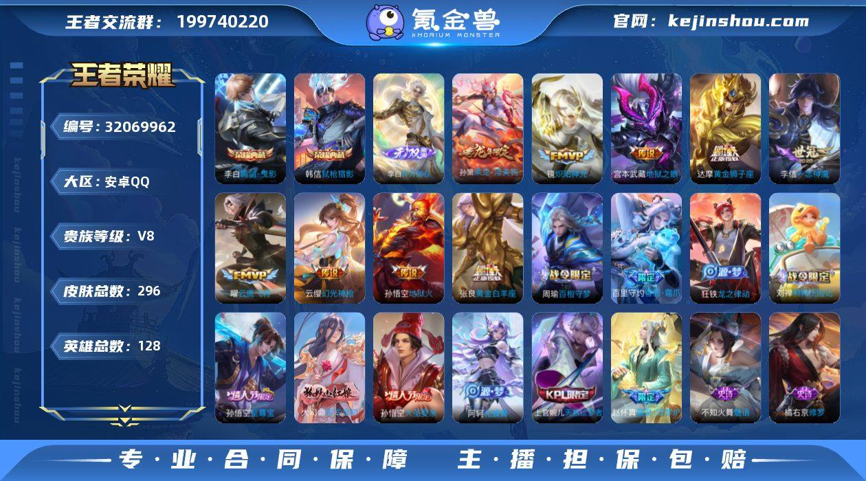 V8 2典藏 1无双 17传说 128英雄 296皮肤 可修改实名 男号 【英雄全皮】空空儿全皮,孙权全皮,蚩奼全皮,大禹全皮 【稀有英雄】敖隐(小龙人),大司命,嬴政(始皇帝),韩信(韩跳跳),夏洛特(夏师傅),艾琳,橘右京(橘子),娜可露露(鸟人),不知火舞,赵云,金蝉(唐僧),戈娅 【荣耀水晶】鸣剑·曳影,弑枪猎影(韩信典藏) 【无双皮】碎月剑心(李白无双) 【传说皮】神骥·镇沧海,乘龙·淬吴钩(孙策年限),幻光神枪,神树通天,千山共赴,黄金狮子座,黄金白羊座,地狱火,地狱之眼,一念神魔,云鹰飞将(小将军),炽阳神光 【珍宝阁皮】万物之道,女武神 【赛季/战令皮】噬灭天穹(s37),古海寻踪(s33),潮玩骑兵,剑破天穹(s35),天穹祈灯(s34),天穹之誓(s36),御旌(s15),御銮(s16),混沌棋(s18),疑决卦(s19),醍醐杖(s20),原初探秘者(s21),万华元夜(s22),演武夺筹(s23),驱傩正仪(s24),千军破阵(s25),银河之约,西部大镖客-猪八戒,暗影游猎(游乐娃子),单词大作战,狂想玩偶喵,潮玩骑士王,云间偶戏,星际陆战队-达摩,胡桃异想国,神迹守卫-墨子,航海奇遇记,沙漠行僧(s26),金庭之子(s27),大漠名商(s28),云中旅人(s29) 【史诗皮】谪仙醉月,破空之剑,星界战将,茶境仙,东方月初,蔬乡物语(鲁班七号),器灵·浮梦炉,化蝶舞,织梦人,线条小狗-周瑜,九幽镇关,巫礼祀神,万灵启世,鸭鸭历险记-刘禅,光弋星穹,涂山容容,百相守梦-周瑜,龙之律动,雪豹·霜爪,百相守梦-黄忠,紫霞仙子,电玩小子(小书包),白龙吟,黄金分割率,特工魅影,千年之狐,高渐离燃音魔法,真我赫兹(百里守约),冰冠公主,偶像歌手,龙骑士(小龙虾),魅语,末日机甲-吕布,猫狗日记-孙策,猫狗日记-大乔,时之恋人-孙尚香,乱世虎臣,节奏热浪,修罗,女仆咖啡,摇滚巨星,水果甜心,绅士熊喵,天才门将,星夜王子,心灵骇客,功夫厨神,德古拉伯爵,幽灵船长,鬼剑武藏,天秀·启明,纤云弄巧,繁星吟游(呼啦呼啦),