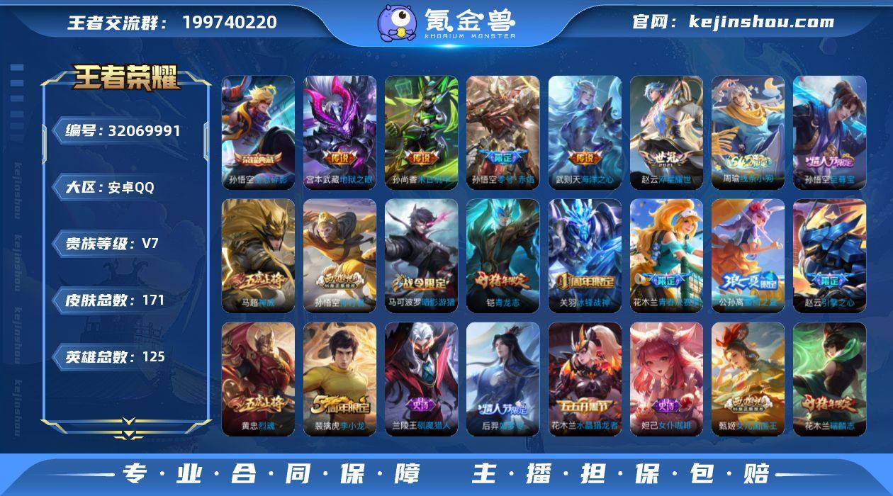 实名: 可修改 性别: 男号 贵族等级: V7 英雄数: 125 皮肤数: 171 荣耀水晶: 全息碎影 传说皮: 末日机甲-孙尚香,零号·赤焰,海洋之心,地狱之眼,淬星耀世 限定皮: 冰锋战神,遇见飞天,李小龙,游园惊梦,梁祝,引擎之心,烈魂,神威,蜜橘之夏,青春决赛季,逐梦之翼,青龙志,瑞麟志,至尊宝,如梦令-后羿,孙行者,女儿国国王 亮点: 【优质装备】:全息碎影(猴子典藏),末日机甲-孙尚香(绿蚂蚱),零号·赤焰,海洋之心,地狱之眼,淬星耀世