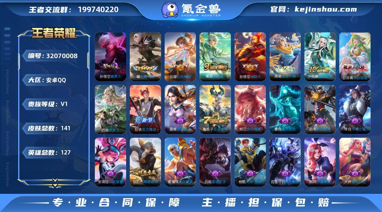 可二次【特价出售/店主推荐】:安卓Q-V5-最强王者段位-127英雄-141皮肤-1星元-4传说-30史诗 【英雄全皮】:孙权全皮 【传说皮肤】:云缨幻光神枪,桑启鸣野蒿,曜云鹰飞将,孙悟空地狱火 【限定皮肤】:姜子牙天穹之誓,杨戬破阵退雄兵,狄仁杰阴阳师,赵云皇家上将,高渐离玩趣恶龙,白起夜都怪侠,达摩沙漠行僧,项羽海滩派对,兰陵王金庭之子,李元芳云中旅人,鬼谷子五谷丰年,苏烈千军破阵,沈梦溪大漠名商,明世隐吟游魔法,裴擒虎擒涛扼浪,鲁班大师探海日志,桑启海盐诗旅,张良古海寻踪,鬼谷子天穹祈灯,刘邦剑破天穹,程咬金群星魔术团,周瑜熔金海岸 【赛季限定】:苏烈千军破阵,达摩沙漠行僧,兰陵王金庭之子,沈梦溪大漠名商,李元芳云中旅人,桑启海盐诗旅,裴擒虎擒涛扼浪,鲁班大师探海日志,张良古海寻踪,鬼谷子天穹祈灯,刘邦剑破天穹,姜子牙天穹之誓,太乙真人谧流熔炉,钟馗虚灵犬护,甄姬逆浪荇歌,亚瑟荣光之誓 【战令限定】:明世隐吟游魔法,白起夜都怪侠,周瑜线条小狗 【史诗皮肤】:周瑜线条小狗,少司缘巫礼祀神,公孙离涂山容容,西施织梦人,狂铁龙之律动,黄忠怒海争锋,鬼谷子五谷丰年,明世隐吟游魔法,杨戬天秀启明,狄仁杰鹰眼统帅,大乔猫狗日记,孙策猫狗日记,阿轲节奏热浪,白起星夜王子,百里守约特工魅影,安琪拉心灵骇客,夏侯惇乘风破浪,吕布末日机甲,李白千年之狐,曹操幽灵船长,墨子金属风暴,妲己女仆咖啡,妲己魅力维加斯,嬴政摇滚巨星,孙尚香水果甜心,宫本武藏鬼剑武藏,廉颇地狱岩魂,王昭君偶像歌手,貂蝉圣诞恋歌,赵云皇家上将,露娜紫霞仙子 【其他皮肤】:虞姬溯影追猎,蚩奼极光幻客,艾琳鹤鸣心笺,孙权径山谋武,亚瑟荣光之誓,鬼谷子克喵,莱西奥踏浪烽翎,云中君云械蓝图,甄姬逆浪荇歌,露娜命运加冕,阿古朵布丁狗之约,张良灵野札记,苏...