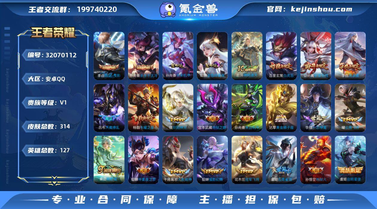【特价出售/店主推荐/5市标/101Q币】:安卓Q-V8-最强王者段位-127英雄-314皮肤-2典藏皮肤-2星元-20传说-90史诗 【荣耀典藏】:孙尚香杀手不太冷,李白鸣剑曳影 【传说皮肤】:后羿神树通天,桑启鸣野蒿,公孙离祈雪灵祝,镜炽阳神光,虞姬启明星使,曜云鹰飞将,李信一念神魔,貂蝉猫影幻舞,干将莫邪久胜战神,虞姬云霓雀翎,达摩黄金狮子座,百里玄策白虎志,花木兰冠军飞将,杨戬永曜之星,貂蝉仲夏夜之梦,李白凤求凰,孙尚香末日机甲,宫本武藏地狱之眼,孙悟空地狱火,吕布天魔缭乱 【限定皮肤】:白起狰,姜子牙天穹之誓,狄仁杰阴阳师,虞姬凯尔特女王,赵云皇家上将,妲己热情桑巴,嬴政白昼王子,孙尚香蔷薇恋人,鲁班七号狮舞东方,庄周蜃楼王,庄周云端筑梦师,孙膑妖精王,扁鹊炼金王,芈月重明,芈月白晶晶,吕布天魔缭乱,吕布猎兽之王,周瑜赤莲之焰,元歌云间偶戏,夏侯惇朔风刀,曹操烛龙,曹操天狼征服者,典韦穷奇,典韦蓝屏警告,马可波罗逐梦之星,马可波罗暗影游猎,狄仁杰魔术师,狄仁杰万华元夜,项羽海滩派对,老夫子醍醐杖,关羽冰锋战神,程咬金演武夺筹,露娜一生所爱,韩信飞衡,兰陵王驯魔猎人,花木兰青春决赛季,花木兰瑞麟志,花木兰默契交锋,亚瑟狮心王,亚瑟潮玩骑士王,孙悟空大圣娶亲,牛魔御旌,后羿辉光之辰,李元芳银河之约,李元芳云中旅人,虞姬启明星使,钟馗神迹守卫,钟馗驱傩正仪,杨玉环遇见飞天,杨戬永曜之星,女娲朔望之晖,干将莫邪冰霜恋舞曲,雅典娜单词大作战,雅典娜黎明之约,蔡文姬繁星吟游,太乙真人饕餮,太乙真人华丽摇滚,东皇太一逐梦之光,鬼谷子原初探秘者,铠青龙志,百里玄策白虎志,百里玄策原初追逐者,百里守约朱雀志,弈星混沌棋,梦奇顽趣,公孙离蜜橘之夏,公孙离祈雪灵祝,沈梦溪星空之诺,明世隐疑决卦,裴擒虎天狼狩猎者,裴擒虎李...