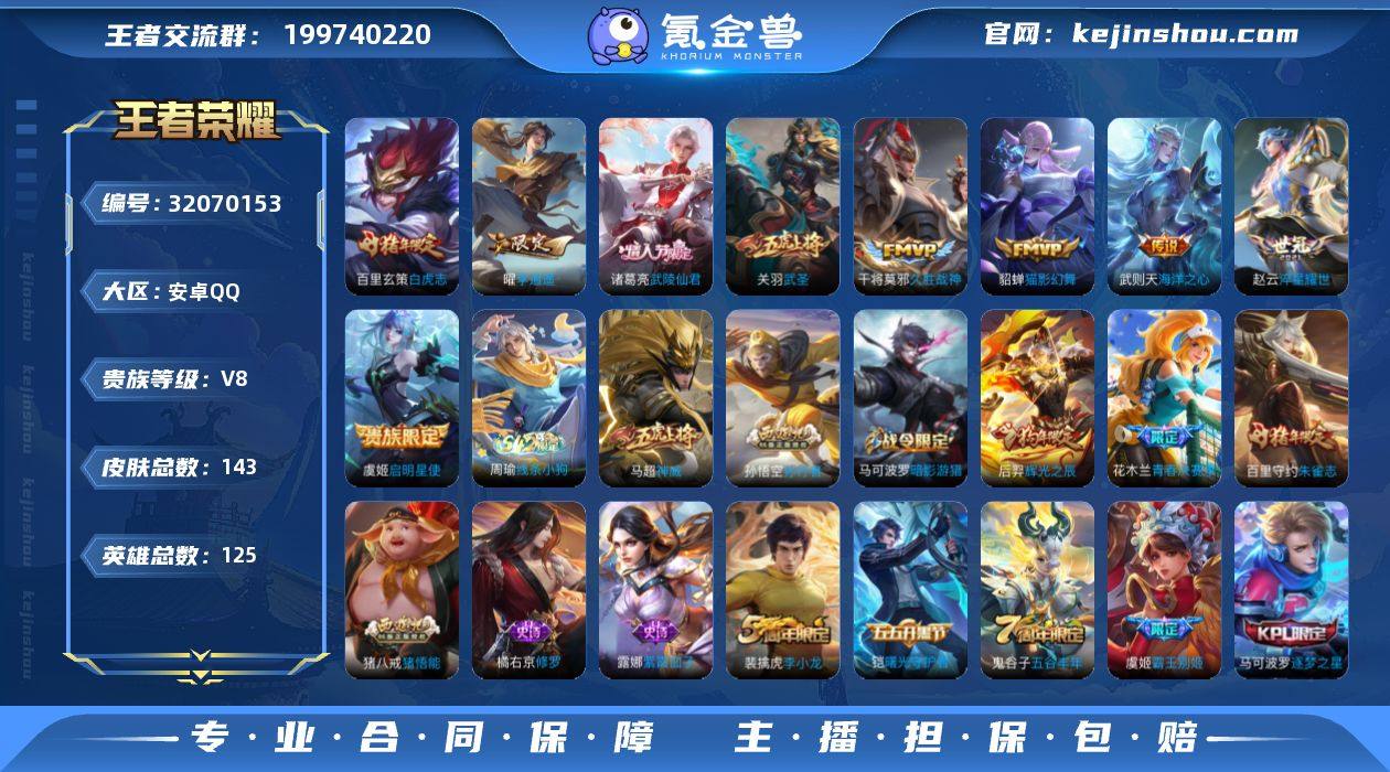 贵族等级:V8 典藏皮肤数:0 珍品无双皮肤数:0 无双皮肤数:0 珍品传说皮肤数:0 传说皮肤数:9 史诗皮肤数:43 皮肤数:143 英雄数:125 段位:王者 卖家说:急用钱急出