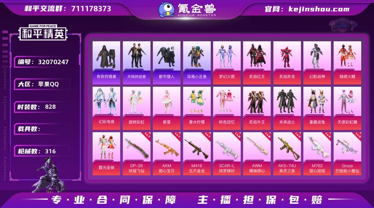 实名:可二次实名 是否支持人脸包赔:支持 粉装数量:15 特效枪数量:12 时装数:828 枪械数:316 奇异狩猎者,都市猎人,深海小丑鱼,天网终结者 炙焰红王,炙焰牛王,粉色回忆,幻彩电音,幻影战神,锦绣火鲤,美雪,梦幻火箭,天使彩虹糖,童趣迷兔,未来战士,霞光圣骑,香水柠檬,旋转彩虹,炙焰赤龙 七级AKM-甜心宝贝,七级DP-28-扶摇飞仙,七级M416-五爪金龙,六级AWM-橘柚倾心,六级SCAR-L-纯梦嫁纱,五级AKS-74U-森灵之息,五级Groza-巴啦啦小魔仙,五级M762-甜心娃娃,四级UMP45-萌骑冒险,四级Kar98K-巳巳如意,二级DP-28-豹影疾电,二级AKM-梦之光华 狙击之神,会说话的汤姆猫,孙斩天,马上有钱,福马献瑞,红釉青花,SS37特训,雨过天青,青翼流星,雪国风尚,画境星梦,琴音绮想,书海巡游,SS36特训,奇异狩猎者,炫彩糖果,萌鸡速递,SS35特训,元气之梦,薄荷星砂,凌霄紫焰,SS34特训套装,游乐,朱霞炽焰,安第斯皇冠,暗黑裁决,暗金炫舞,Alan Walker,暗影爵士,暗夜契约,冰川格斗者,冰冻风暴,缤纷果语,暴风机械师,缤纷焰火,滨海厨神,冰河战士,白色伏地魔,白熊同盟,纯白誓言,春光漫游,彩虹兔,初火先锋,裁决冥王,长空猛禽,潮流游乐家,超能拳王,春日漫步,顶瓜瓜,蝶变,大橘大利,呆萌铁蟹,都市猎人,都市魅力,飞驰魅影,绯格组合,粉红小猪,福星高照,飞行日记,格斗先锋,龟仙人,光影梦想家,红潮炫舞,海岛探路者,虎虎生威吉莉,黄金大亨,湖畔霞光,幻世保卫者,灰色格斗者,海上生明月,黄色运动,幻世战舞者,幻羽潜行,军刀雅典娜,惊鸿侠骨,娇憨猪猪,竞技名士,吉莉礼服,静谧青瓷,坚韧舞者,极速竞梦,街头潮人,街头风暴,机械征服者,军械专家,锦衣飞扬,金羽特工,绛羽幽主,空岛之星,科技之星,快乐星愿,快闪甜心,空投萌叽,龙的传人,龙魂突击队,冷酷挑战者,六六大吉,玲珑飞花,黎明保卫者,猎梦纪元,浪漫天命,镭射皇者,蓝甜马卡龙,漫步者,抹茶蜜豆,萌黄之夏,魔力冰咖,魅力单车,麻辣教官,蜜露汐语,懵萌河马,萌趣咩咩,萌趣颜团子,卖崽青蛙,逆风勇士,霓虹极客,怒火燎原,牛气冲天,牛气满满,破蛋小黄鸡,青春冒险家,绮丽涂鸦,奇趣章鱼,千禧之恋,青玉碎影,云朵鹅,瑞龙福将,热血青春,软羊咩咩,忍者信条,丝绸行者,韶华初心,深海来使,深海小丑鱼,闪金天王,水晶王族,时空追击者,深蓝色名流,沙漠兵团,神秘领域,神气柴柴,SS10特训,SS11特训,SS12特训,SS13特训,SS14特训,SS15特训,SS16特训,SS17特训,SS18特训,SS19特训,SS20特训,SS21特训,SS22特训,SS24特训,SS25特训,SS26特训,SS27特训,SS28特训,SS29特训,SS30特训套装,SS31特训套装,SS32特训套装,SS33特训套装,SS9特训,巳巳如意,探宝勇士,甜蜜告白,甜蜜熊情侣,特殊使命,涂山之恋,天网终结者,甜心亚梦,团圆交子,特种颜团子,特战装甲,微雨春柳,星河入梦,迅捷狂鲨,娴静芝兰,迅捷之星,星梦畅游,雪绒豹,旭日情侣,夏日音浪,香桃花海,星途旅人,虚音幻奏,银白舞王,原初圣火,异彩先驱,耀动青春,银河圣歌,隐空刺,元气发射,云丝凤蟒,音速流光,影双刃,玉兔迎春,野性山猫,鹰眼刺客,焰鹰斗篷,鱼渊荷华,燕燕于飞,异域银装,智谋强哥,灼焰舞者,治愈之星 炫彩糖果飞行器,梦幻火箭飞行器,天之羽翼飞行器,星之彼岸飞行器,炫彩糖果降落伞,阿狸红降落伞,巴啦啦小魔仙降落伞,春暖花开降落伞