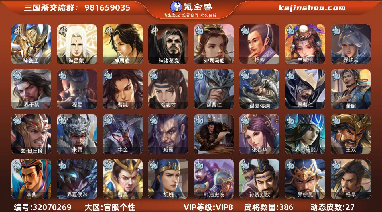 官阶: 大将军 VIP等级: VIP8 武将数量: 386 动态皮肤数量: 27 神将: 神张辽,神吕蒙,神周瑜,神诸葛亮 魏国武将: 戏志才,曹纯,程昱,界于禁,界钟会,羊徽瑜,杨修,唐咨-魏,张辽,SP蔡文姬,SP曹仁,SP关羽,SP贾诩,SP姜维,SP庞德,卞夫人,蔡贞姬,曹昂,曹操,曹冲,曹洪,曹丕,曹仁,曹叡,贾逵,王异,张恭,鲁芝,界满宠,曹休,界曹植,满宠,荀攸,王基,钟繇,蒯越蒯良,郭嘉,荀彧,阮慧,杜畿,界郭嘉,崔琰,界曹丕,界荀彧,朱灵,界甄姬,吕虔,界陈群,界王异,界许褚,界郭淮,华歆,陈群,界邓艾,界典韦,界曹休,袁涣,李通,乐进,辛宪英,谋曹仁,郭淮,毛玠,界曹彰,郭皇后,毌丘俭,夏侯惇,曹植,司马朗,谋于禁,界曹操,许褚,界张辽,谋徐晃,张郃,钟会,文聘,曹彰,界夏侯惇,诸葛诞,司马懿,甄姬,杨阜,界徐晃,徐晃,界曹仁,孙资刘放,韩浩史涣,胡班,曹真,典韦,界夏侯渊,夏侯渊,李典,于禁,王双,邓艾,界司马懿,张春华,孟达-魏,臧霸,牛金,朱灵(国战),玄·毌丘俭,SP司马昭,董昭,谋夏侯渊 蜀国武将: 董允,谯周,沙摩柯,赵襄,谋赵云,马云騄,徐庶,界魏延,杨仪,吕凯,界关羽,界诸葛亮,界伊籍,胡金定,费祎,严颜,界黄月英,界张嶷,赵云,张松,彭羕,李丰,界刘备,界刘禅,刘封,糜竺,谋庞统,黄月英,刘巴,关羽,王甫赵累,吴懿,吴班,向宠,祝融,张飞,黄皓,陈震,魏延,界周仓,马忠,界法正,糜夫人,界孟获,刘禅,界赵云,界姜维,张翼,关银屏,界祝融,SP孙尚香,SP徐庶,卧龙诸葛,周仓,简雍,界关兴张苞,诸葛亮,孙乾,界张飞,界卧龙诸葛,法正,界简雍,赵统赵广,陈到,界马岱,关平,马岱,界庞统,庞统,诸葛果,谋张飞,马谡,马超,廖化,关兴张苞,谋关羽,孟获,秦宓,吴苋,夏侯氏,姜维,黄忠,刘备,界马超,李严,马良,蒋琬费祎,刘谌,彭羕(国战),甘夫人,蜀-糜芳傅士仁 吴国武将: 贺齐,界徐盛,界朱然,留赞,骆统,吴景,潘濬,陆绩,张温,周泰,全琮,吕蒙,SP庞统,诸葛恪,界孙尚香,大乔小乔,界程普,许贡,丁奉,谋吕蒙,周鲂,孙...
