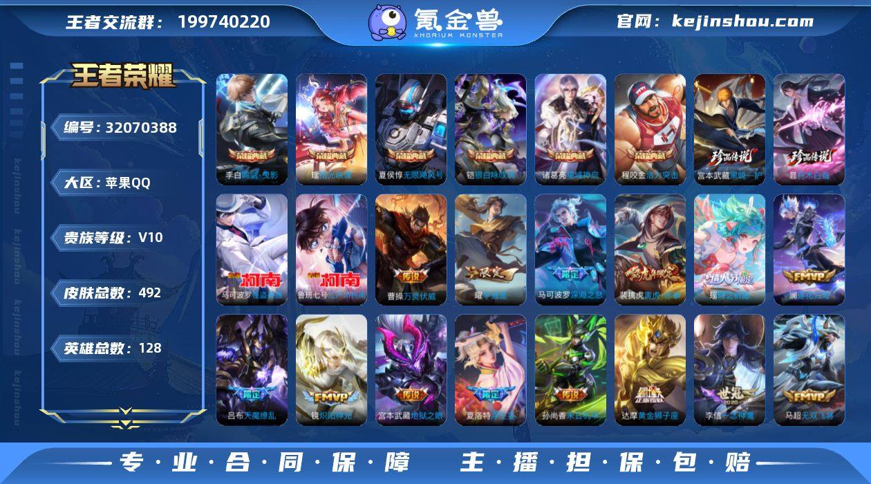 实名: 可修改 性别: 男号 贵族等级: V10 英雄数: 128 皮肤数: 492 荣耀水晶: 无限飓风号,活力突击,鸣剑·曳影,星域神启,银白咏叹调,拾光映像 珍品传说: 江户川柯南,怪盗基德,朽木白哉,黑崎一护 传说皮: 黄金狮子座,黄金射手座,冠军飞将,云鹰飞将,绛天战甲,黄金白羊座,猫影幻舞,久胜战神,炽阳神光,一念神魔,云霓雀翎,末日机甲-孙尚香,地狱火,音你心动-小乔,零号·赤焰,海洋之心,地狱之眼,飞鸢探春,音你心动-周瑜,胖达荣荣,李逍遥,乞巧织情,时之恋人-刘备,游龙清影,淬星耀世,超时空战士-狄仁杰,末日机甲-孙策,花朝如约,挚爱之约,挚爱花嫁,无双飞将,音你闪耀,碎云,天秀幻梦,炽翼辉光,燃星之曲,画中仙,浮生妄,记忆之芯,百相守梦(张飞),电玩·雷克斯,鹤羽星尊,灼幽烈阳,妄想实况,妄想奇谈,鹤归松栖(云缨),澜逐花归海,艾琳觅芳踪,万灵伏威 限定皮: 冰锋战神,李小龙,奔雷神使,游园惊梦,梁祝,御风骁将,云端筑梦师,时雨天司,引擎之心,龙胆,白鹤梁神女,武圣,烈魂,魔法小厨娘,辉光之辰,白晶晶,天狼溯光者,天魔缭乱,时之彼端,奇迹圣诞,天狼运算者,逐梦之星,逐梦之影,热情桑巴,神奇女侠,天狼绘梦者,寅虎·御盾,美猴王,青龙志,朱雀志,凤凰于飞,纯白花嫁,至尊宝,真爱至上,武陵仙君,大圣娶亲,寅虎·瑞焰,霸王别姬-项羽,霸王别姬-虞姬,高山流水,圣诞老人,匿光追影者,女儿国国王,傲雪梅枪,寅虎·赤拳,寅虎·心曲,寅虎·展翼,时之祈愿-云中君,时之祈愿-瑶,补天,百木心枪,玉兔公主,启示之音,匿光决锋者,无尽星芒,深海之息,唐三藏,前尘镜,枫霜尽,匿光启智者,时之奇旅-妲己,星穹之声,五谷丰年,绯月行,怒海麟威,山海·玄木吟,齐天大圣,无限倾心-虞姬,鸣野蒿,陌上桑,映山客,逐霄战戟 亮点: 【优质装备】:无限飓风号(高达),活力突击,鸣剑·曳影,星域神启(倪克斯贼亮),银白咏叹调(倪克斯侍卫),拾光映像(瑶典藏),江户川柯南,怪盗基德,朽木白哉,黑崎一护,...