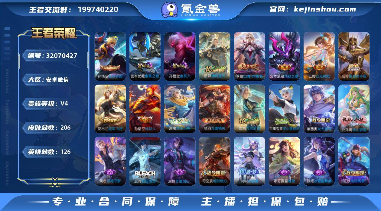 贵族等级:V4 典藏皮肤数:1 珍品无双皮肤数:0 无双皮肤数:0 珍品传说皮肤数:0 传说皮肤数:7 史诗皮肤数:65 皮肤数:206 英雄数:126 段位:荣耀王者