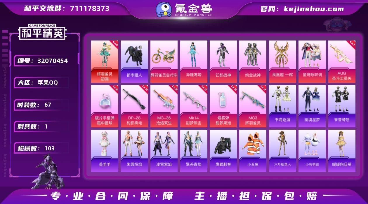 【2级初翊 都市 满地铁天赋】YXc26570-【无二次协助处理】【因赛季更新游戏段付以上号为准!】 苹果Q-1红装1稀有1载具5粉装9特效枪5热门67套装103枪皮 5印记 历史绝世王牌17星 【1红装】 辉羽雀灵-初翊 (2级) 【1稀有】 都市猎人 【1载具】 辉羽雀灵自行车 【5粉装】 凤凰座一辉 异瞳寒姬 星穹咏叹调 幻影战神 绚金战神 【9特效枪】 MG3-辉羽雀灵 (3级) MG-36-沧焰双生 (5级) DP-28-豹影疾电 (5级) AUG-圣斗士星矢 (7级) Mk14-甜梦熊击 (5级) Mk14-福马献瑞 (1级) ACE32-萌骑漫游 (4级) 破片手榴弹-瓶中星球 (6级) 烟雾弹-甜梦果泡 (5级) 【5热门】 小丑鱼 六号稻草人 鹰眼刺客 漫步者 破蛋小黄鸡 【1背包】 深海小丑鱼背包