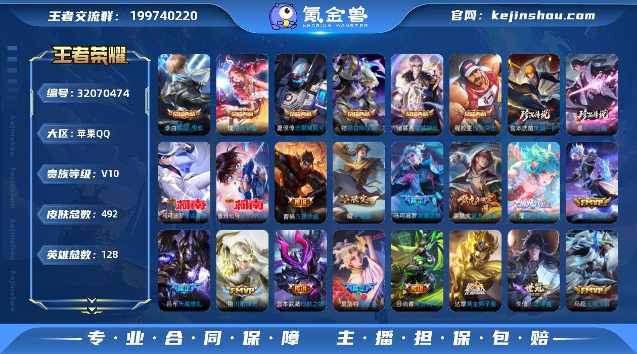 实名: 可修改 性别: 男号 贵族等级: V10 英雄数: 128 皮肤数: 492 荣耀水晶: 无限飓风号,活力突击,鸣剑·曳影,星域神启,银白咏叹调,拾光映像 珍品传说: 江户川柯南,怪盗基德,朽木白哉,黑崎一护 传说皮: 黄金狮子座,黄金射手座,冠军飞将,云鹰飞将,绛天战甲,黄金白羊座,猫影幻舞,久胜战神,炽阳神光,一念神魔,云霓雀翎,末日机甲-孙尚香,地狱火,音你心动-小乔,零号·赤焰,海洋之心,地狱之眼,飞鸢探春,音你心动-周瑜,胖达荣荣,李逍遥,乞巧织情,时之恋人-刘备,游龙清影,淬星耀世,超时空战士-狄仁杰,末日机甲-孙策,花朝如约,挚爱之约,挚爱花嫁,无双飞将,音你闪耀,碎云,天秀幻梦,炽翼辉光,燃星之曲,画中仙,浮生妄,记忆之芯,百相守梦(张飞),电玩·雷克斯,鹤羽星尊,灼幽烈阳,妄想实况,妄想奇谈,鹤归松栖(云缨),澜逐花归海,艾琳觅芳踪,万灵伏威 限定皮: 冰锋战神,李小龙,奔雷神使,游园惊梦,梁祝,御风骁将,云端筑梦师,时雨天司,引擎之心,龙胆,白鹤梁神女,武圣,烈魂,魔法小厨娘,辉光之辰,白晶晶,天狼溯光者,天魔缭乱,时之彼端,奇迹圣诞,天狼运算者,逐梦之星,逐梦之影,热情桑巴,神奇女侠,天狼绘梦者,寅虎·御盾,美猴王,青龙志,朱雀志,凤凰于飞,纯白花嫁,至尊宝,真爱至上,武陵仙君,大圣娶亲,寅虎·瑞焰,霸王别姬-项羽,霸王别姬-虞姬,高山流水,圣诞老人,匿光追影者,女儿国国王,傲雪梅枪,寅虎·赤拳,寅虎·心曲,寅虎·展翼,时之祈愿-云中君,时之祈愿-瑶,补天,百木心枪,玉兔公主,启示之音,匿光决锋者,无尽星芒,深海之息,唐三藏,前尘镜,枫霜尽,匿光启智者,时之奇旅-妲己,星穹之声,五谷丰年,绯月行,怒海麟威,山海·玄木吟,齐天大圣,无限倾心-虞姬,鸣野蒿,陌上桑,映山客,逐霄战戟 亮点: 【优质装备】:无限飓风号(高达),活力突击,鸣剑·曳影,星域神启(倪克斯贼亮),银白咏叹调(倪克斯侍卫),拾光映像(瑶典藏),江户川柯南,怪盗基德,朽木白哉,黑崎一护,...