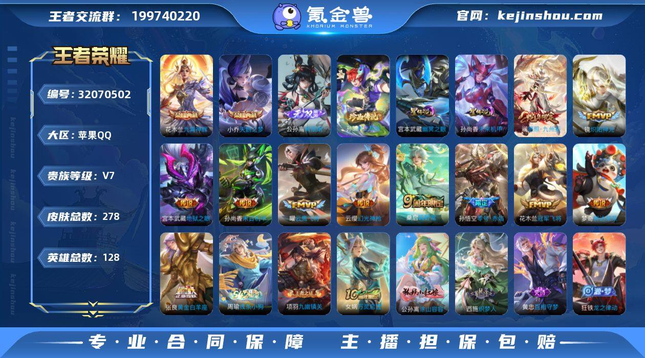 贵族等级:V7 典藏皮肤数:2 珍品无双皮肤数:0 无双皮肤数:1 珍品传说皮肤数:1 传说皮肤数:11 史诗皮肤数:73 皮肤数:278 英雄数:128 段位:非凡王者 卖家说:离恨烟和两个荣耀典藏 诚心卖不墨迹