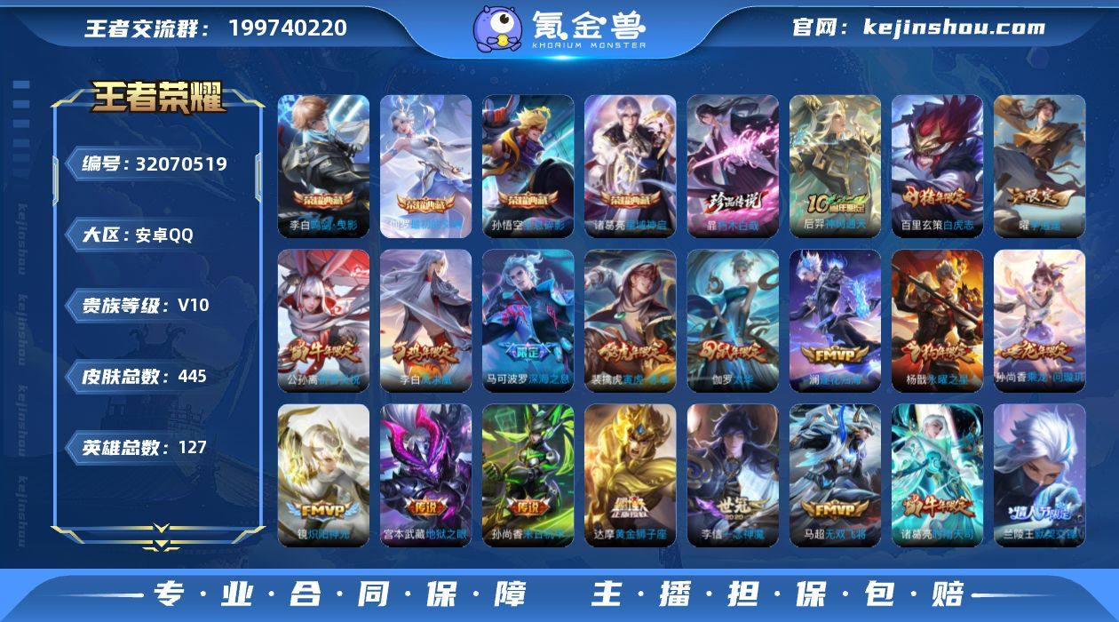 实名: 可修改 贵族等级: V10 英雄数: 127 皮肤数: 445 荣耀水晶: 鸣剑·曳影,全息碎影,星域神启,最初的交响 珍品传说: 朽木白哉 传说皮: 黄金狮子座,黄金射手座,云鹰飞将,黄金白羊座,炽阳神光,一念神魔,云霓雀翎,末日机甲-孙尚香,地狱火,仲夏夜之梦,零号·赤焰,地狱之眼,音你心动-周瑜,胖达荣荣,李逍遥,时之恋人-刘备,淬星耀世,超时空战士-狄仁杰,末日机甲-孙策,无双飞将,碎云,澜逐花归海,艾琳觅芳踪,乘龙·问璇玑,幻光神枪,神树通天 限定皮: 冰锋战神,遇见飞天,李小龙,奔雷神使,祈雪灵祝,游园惊梦,梁祝,御风骁将,时雨天司,龙胆,白鹤梁神女,武圣,烈魂,辉光之辰,异界灵契,白晶晶,天狼溯光者,神威,永曜之星,飞衡,太华,冰霜恋舞曲,天狼运算者,逐梦之影,凤求凰,寅虎·御盾,白虎志,青龙志,玄武志,朱雀志,凤凰于飞,至尊宝,默契交锋-兰陵王,一生所爱,大圣娶亲,默契交锋-花木兰,寅虎·瑞焰,霸王别姬-项羽,高山流水,孙行者,匿光追影者,女儿国国王,傲雪梅枪,寅虎·赤拳,寅虎·心曲,寅虎·展翼,时之祈愿-云中君,补天,百木心枪,玉兔公主,启示之音,匿光决锋者,深海之息,唐三藏,前尘镜,枫霜尽,五谷丰年,绯月行,鸣野蒿 亮点: 【精品号手慢无】金标李白,后羿,v10性价比号,打野36段,全套虎年限定,天幕不羡仙,荣耀典藏鸣剑·曳影,全息碎影,星域神启,最初的交响,珍品传说朽木白哉,传说皮黄金狮子座,黄金射手座,云鹰飞将,黄金白羊座,炽阳神光,一念神魔,云霓雀翎,
