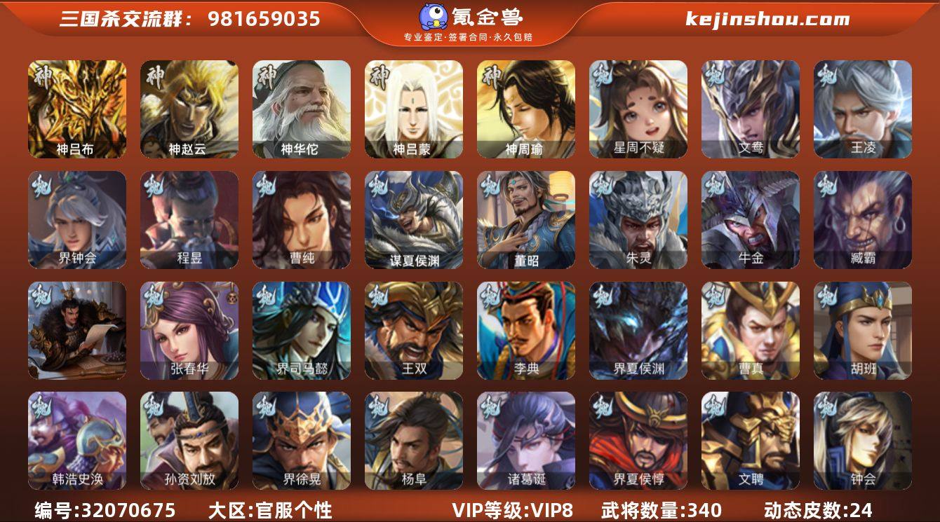官阶: 大将军 VIP等级: VIP8 武将数量: 340 动态皮肤数量: 24 神将: 神吕布,神赵云,神吕蒙,神周瑜,神华佗 魏国武将: 曹纯,程昱,界钟会,王凌,文鸯,唐咨-魏,张辽,SP蔡文姬,SP关羽,SP贾诩,SP姜维,SP庞德,曹昂,曹操,曹冲,曹洪,曹丕,曹仁,曹叡,王异,张恭,鲁芝,界满宠,界曹植,满宠,荀攸,钟繇,蒯越蒯良,郭嘉,荀彧,阮慧,杜畿,界郭嘉,崔琰,界曹丕,界荀彧,朱灵,界甄姬,吕虔,界王异,界许褚,华歆,陈群,界曹休,袁涣,李通,乐进,辛宪英,郭淮,毛玠,毌丘俭,夏侯惇,曹植,司马朗,谋于禁,界曹操,星周不疑,许褚,界张辽,谋徐晃,张郃,钟会,文聘,曹彰,界夏侯惇,诸葛诞,司马懿,甄姬,杨阜,界徐晃,徐晃,孙资刘放,韩浩史涣,胡班,曹真,典韦,界夏侯渊,夏侯渊,李典,于禁,王双,邓艾,界司马懿,张春华,孟达-魏,臧霸,牛金,朱灵(国战),董昭,谋夏侯渊 蜀国武将: 董允,花鬘,谯周,沙摩柯,诸葛瞻,谋马超,谋赵云,徐庶,吕凯,界关羽,界诸葛亮,邓芝,界伊籍,费祎,界黄月英,赵云,张松,彭羕,李丰,界刘备,谋姜维,刘封,糜竺,谋庞统,黄月英,刘巴,关羽,吴懿,界吴懿,界廖化,祝融,张飞,黄皓,魏延,界周仓,马忠,界法正,糜夫人,界孟获,刘禅,界赵云,界姜维,张翼,关银屏,界祝融,SP孙尚香,SP徐庶,卧龙诸葛,周仓,简雍,界关兴张苞,诸葛亮,界张飞,法正,界简雍,界马岱,关平,马岱,界庞统,庞统,诸葛果,谋张飞,马谡,马超,霍峻,廖化,关兴张苞,孟获,夏侯氏,姜维,黄忠,刘备,界马超,李严,马良,蒋琬费祎,刘谌,彭羕(国战),甘夫人,SP甘夫人 吴国武将: 界徐盛,周处,文鸯,潘濬,张温,周泰,全琮,吕蒙,诸葛恪,界孙尚香,界顾雍,大乔小乔,许贡,丁奉,谋吕蒙,界全琮,孙茹,蒋钦,顾雍,阚泽,孙亮,严畯,界孙权,界孙休,祖茂,濮阳兴,界虞翻,界吕蒙,孙登,界孙策,凌操,朱治,孙尚香,程普,大乔,韩当,陆逊,诸葛瑾,朱然,吕范,太史慈,周妃,虞翻,界孙坚,界黄盖,孙鲁班,界周瑜,界潘璋马忠,卫温诸葛直,孙权,界小乔,鲁肃...