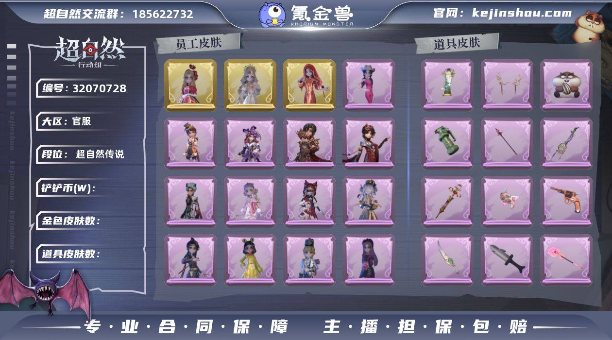 【账号已绑定信息】:邮箱 【耀世皮肤】:爱丽丝-血色中的玛丽,薇薇安-圣光之谕,巫铃儿-镜花辞 【典藏皮肤】:小黄-呱呱雨衣,爱丽丝-耀眼的你,爱丽丝-甜梦派对,爱丽丝-丝缕哀歌,零-搬开山,零-青云逸歌,阿念-庆宴绮愿,阿念-王子与骑士,逍遥-绣春逍影,薇薇安-仙锋小姐,薇薇安-白光莹,薇薇安-黑月挽歌,巫铃儿-素影瑶光,莉莉-莓果陷阱,莉莉-情公主,莉莉-除妖小师妹,艾伦-黎明猎手,爱德华-梵卓之礼,兰-千夜星谕 【头饰】:马上有钱,饺饺者头套,腊肠扭扭,烛光纪念,蒜了八,太空鲨头套,雪墩墩头套,小财神豚豚头套,精致露比头套,樱桃奶油布丁,惊魂南瓜头套,火爆了头套,炙热烧烤,小狗蛇点点头套,驼半仙头套,鱼头怪头套,烈焰红唇头套,面具马头套,哈士奇头套,萨卡班甲鱼头套,卑微头套,呆滞头套,嘻嘻头套,滑稽头套 【背饰】:牛啤背包,白鼬趴趴,潮汐小海兔,蝶恋花,绒团小狐狸,天使的呼唤,毛球夹子,在逃小新娘,兔先生的时钟 【挂饰】:不朽的今夜,拂云仙,晚安小熊,糖果守卫,九色祥鹿,钗头凤,小鲨包包,未竟乐园 【道具皮肤】:铲子-卡皮巴拉小黄豚铲,铲子-赞萌波板糖,铲子-龙鳞,传送按钮-浮生一梦,传送按钮-昆仑镜,传送按钮-幻宠之门,桃木剑-永眠曲,桃木剑-最后的独角兽,腰包-红运福虎,腰包-惊魂娃娃,腰包-宝剑八,额外的背包-飞花令,长枪-罪棘,长鞭-缚誓之锁,长鞭-小狗蛇点点鞭,摸金符-紫霄,摸金符-花落精绝,短管猎枪-赞萌露比水枪,短管猎枪-星光的裁决,专业手电-云端梦想计划,黄牛能量饮料-雪顶奇愿,黄牛能量饮料-珍珠芭乐莓莓,夜视仪-金丝眼镜,夜视仪-敛花容,夜视仪-心跳眼镜,音响-月光奏鸣曲,音响-咏叹调,音响-冬夜暖忆,音响-鸣沙鼓,刺刀-碧络琅环,刺刀-小鲨匕首,荧光棒-桃心,喷气背包-乘风溯雪,转轮手枪-新星时代,电击枪-权杖...