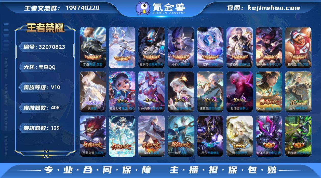 【精品推荐贵族v10·秋月华灯天幕·金标花木兰·金标后羿·金标瑶·金标伽罗·9典藏·1无双·28传说·5星传说·苍灵仙君·神罪·鸣剑曳影·星域神启·幻阙歌·最初的交响·无限飓风号·天鹅之梦·杀手不太冷·活力突击·武则天·神骥赴朔漠·千劫归真·太华·白虎志·武陵仙君·天魔缭乱·愿照众生和·游龙清影·炽阳神光·一念神魔·可二次】YXw17860-苹果Q-129英雄-406皮肤-16王者印记-300铭文-贵族积分20w【贵族10】【9典藏·1无双·5星传说·28传说·2天幕·10按键·203个性戳戳】【因赛季更新游戏段付以上号为准!】 【英雄全皮】:孙权全皮,鬼谷子全皮,狂铁全皮,敖隐全皮,空空儿全皮,影全皮 【荣耀典藏】:武则天英雄,夏侯惇无限飓风号,小乔天鹅之梦,孙尚香杀手不太冷,程咬金活力突击,李白鸣剑曳影,诸葛亮星域神启,貂蝉幻阙歌,伽罗最初的交响 【无双皮肤】:铠神罪 【星元皮肤】:诸葛亮苍灵仙君,鲁班七号寅虎焰心,孙尚香未来机甲,孙悟空幽冥火,貂蝉金色仲夏夜 【天幕】:秋月华灯天幕,共赏芳华天幕 【传说皮肤】:狄仁杰神骥赴朔漠,后羿神树通天,后羿千劫归真,妲己愿照众生和,云缨幻光神枪,桑启鸣野蒿,艾琳觅芳踪,孙尚香音你闪耀,赵云淬星耀世,西施游龙清影,镜炽阳神光,虞姬启明星使,曜云鹰飞将,李信一念神魔,伽罗太华,干将莫邪久胜战神,虞姬云霓雀翎,百里玄策白虎志,花木兰冠军飞将,后羿黄金射手座,诸葛亮武陵仙君,貂蝉仲夏夜之梦,李白凤求凰,孙尚香末日机甲,宫本武藏地狱之眼,孙悟空地狱火,吕布天魔缭乱,武则天海洋之心 【限定皮肤】:白起狰,姜子牙天穹之誓,狄仁杰阴阳师,虞姬凯尔特女王,赵云皇家上将,墨子神迹守卫,妲己时之彼端,嬴政优雅恋人,嬴政白昼王子,孙尚香蔷薇恋人,庄周蜃楼王,庄周高山流水,高渐离死亡摇滚,钟无艳超时空战士,孙膑妖精王,扁鹊炼金王,白起夜都怪侠,芈月...