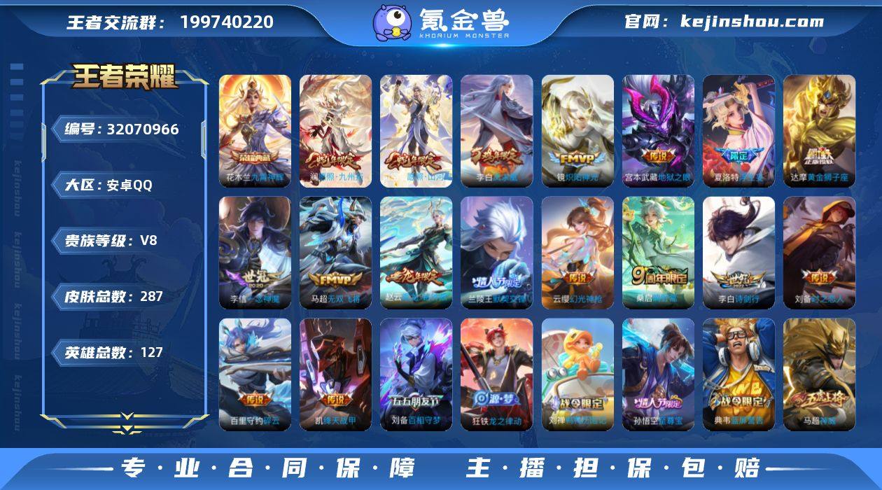 127英雄-287皮肤-安卓QQ 可二次/v8/至尊星耀/凤求凰 李白,诗剑行 李白,浮生妄 夏洛特,神骥·逐星野 马超,地狱之眼 宫本武藏,神骥·镇沧海 关羽,默契交锋 兰陵王,炽阳神光 镜,时之恋人 刘备,黄金狮子座 达摩,一念神魔 李信,乘龙·铭钟鼎 赵云,绛天战甲 铠,愿照·九州拓 澜,神树通天 后羿,幻光神枪 云缨,愿照·山河定 司空/287皮肤/127英雄/1典藏/0珍品无双/0无双/0珍品传说/21传说/91史诗/8稀有英雄 【1 典藏皮肤】九霄神辉 花木兰, 【21 传说皮肤】启明星使 虞姬,碎云 百里守约,无双飞将 马超,凤求凰 李白,诗剑行 李白,浮生妄 夏洛特,神骥·逐星野 马超,地狱之眼 宫本武藏,神骥·镇沧海 关羽,默契交锋 兰陵王,炽阳神光 镜,时之恋人 刘备,黄金狮子座 达摩,一念神魔 李信,乘龙·铭钟鼎 赵云,绛天战甲 铠,愿照·九州拓 澜,神树通天 后羿,幻光神枪 云缨,愿照·山河定 司空震,鸣野蒿 桑启, 【91 史诗皮肤】电玩小子 鲁班七号,末日机甲 吕布,蔬乡物语 鲁班七号,紫霞仙子 露娜,百解令 蒙犽,银河之约 李元芳,暗渊魔法 司马懿,燃音魔法 高渐离,天秀·启明 杨戬,糖绘人间 亚连,德古拉伯爵 刘邦,山海·玄木吟 马可波罗,心灵战警 亚瑟,五谷丰年 鬼谷子,无心 元歌,巫礼祀神 少司缘,鬼剑武藏 宫本武藏,百相守梦 黄忠,星夜王子 白起,地狱燃心 司空震,线条小狗 周瑜,百晓客 明世隐,电玩高手 狂铁,修罗 橘右京,拒霜思 嫦娥,魅力维加斯 妲己,黄金分割率 诸葛亮,偶像歌手 王昭君,荣光圣徽 蒙恬,女仆咖啡 妲己,九幽镇关 项羽,星界游侠 暃,晚萤 娜可露露,暗夜贵公子 嬴政,鹰眼统帅 狄仁杰,玫瑰异探 镜,李小龙 裴擒虎,光弋星穹 莱西奥,金属风暴 墨子,傲雪梅枪 韩信,特工魅影 百里守约,猫狗日记 孙策,原初追逐者 百里玄策,逐浪之夏 李元芳,奇幻香踪 扁鹊,时之祈愿 云中君,未来纪元 赵云,黎明之约 雅典娜,鸭鸭历险记 刘禅,驭风魔法 戈娅,魔术师 狄仁杰,...