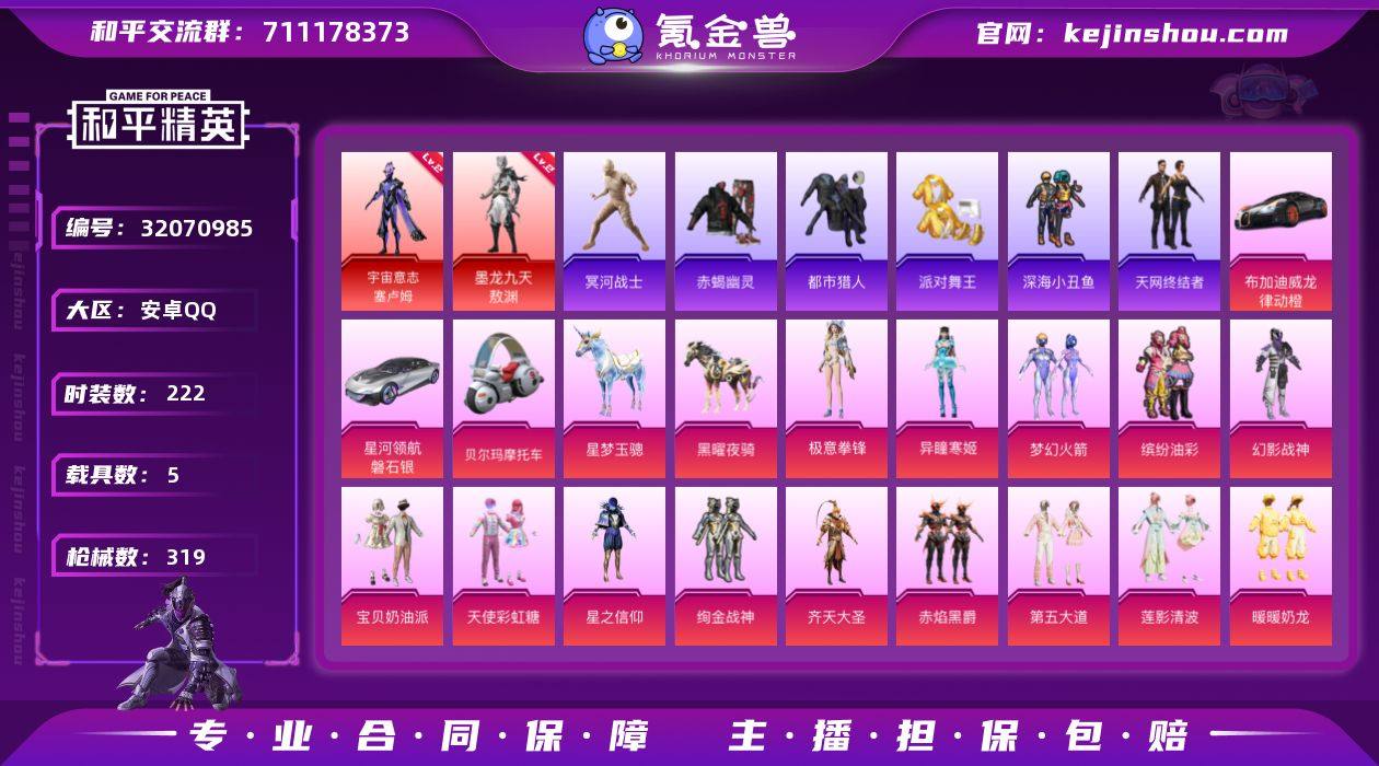 安卓 手Q-2神装-25粉装-19特效枪-5载具-15粉色飞行器-111367热力值-12王牌印记-222套装-319枪皮 【红色神装等级】:宇宙意志-塞卢姆(二级),墨龙九天-敖渊(二级) 【红色角色神装】:宇宙意志-塞卢姆,墨龙九天-敖渊 【热门品类】:粉装-梦幻火箭,粉装-缤纷油彩,套装-浪漫天命,套装-赤蝎幽灵,套装-都市猎人,套装-冥河战士,套装-派对舞王,套装-深海小丑鱼,套装-天网终结者,套装-龟仙人,套装-暗影哥特,角色-8号机,角色-Mark.06 【粉色套装】:粉装-幻影战神,粉装-宝贝奶油派,粉装-天使彩虹糖,粉装-梦幻火箭,粉装-星之信仰,粉装-缤纷油彩,粉装-绚金战神,粉装-齐天大圣,粉装-赤焰黑爵,粉装-第五大道,粉装-莲影清波,粉装-暖暖奶龙,角色-冰炎战车,角色-紫钛骑兵,角色-圣堂之誓,角色-烟云彩露,角色-美琪,角色-超弦星,角色-初号机 觉醒Ver.,角色-智耀战神,角色-狂魇小丑,角色-冷漠罗丽,角色-荧海星豚,角色-异瞳寒姬,粉装-极意拳锋 【粉色枪皮等级】:AKM-甜心宝贝(五级),AKM-幽焰骑士(三级),SCAR-L-纯梦嫁纱(四级),M416-电玩时刻(五级),M416-墨龙九天(三级),M416-灵猫魔法师(三级),GROZA-精灵之光(三级),AUG-星之彼岸(六级),M762-电糖天使(五级),UMP45-量子极限(五级),UMP45-宇宙意志(三级),汤姆逊-热量炸弹(五级),Kar98K-巳巳如意(五级),Kar98K-圣域龙灵(三级),Mk14-福马献瑞(四级),AMR-智耀战神(四级),M200-梦海之灵(三级),DP-28-豹影疾电(五级) 【粉色载具】:布加迪威龙(律动橙),星河领航(磐石银),布尔玛摩托车,星梦玉骢,黑曜夜骑 【粉色枪皮】:AKM-甜心宝贝,AKM-幽焰骑士,SCAR-L-纯梦嫁纱,M416-电玩时刻,M416-墨龙九天,M416-灵猫魔法师,GROZA-精灵之光,AUG-星之彼岸,M762-电糖天使,UMP45-量子极限,UMP45-宇宙意志,汤姆逊-热量炸弹,Kar98K-...
