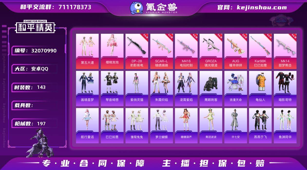 安卓 手Q-3粉装-11特效枪-0载具-2粉色飞行器-51768热力值-4王牌印记-143套装-197枪皮 【热门品类】:套装-浪漫天命,套装-龟仙人,套装-暗影哥特 【粉色套装】:粉装-第五大道,角色-樱桃泡泡,人物-小舞·灵珑 【粉色枪皮等级】:SCAR-L-锦绣绵绵(五级),M416-电玩时刻(五级),GROZA-镜光银凌(五级),AUG-暖羊咩咩(五级),UMP45-萌骑冒险(五级),Kar98K-巳巳如意(五级),Mk14-甜梦熊击(五级),Mk14-福马献瑞(五级),AA12-G-萌骑幻想(五级),DP-28-豹影疾电(五级),PKM-萌骑夺宝(五级) 【粉色枪皮】:SCAR-L-锦绣绵绵,M416-电玩时刻,GROZA-镜光银凌,AUG-暖羊咩咩,UMP45-萌骑冒险,Kar98K-巳巳如意,Mk14-甜梦熊击,Mk14-福马献瑞,AA12-G-萌骑幻想,DP-28-豹影疾电,PKM-萌骑夺宝 【粉色飞行器】:炫彩糖果飞行器,天之羽翼飞行器 【粉色降落伞】:第五大道降落伞,闲梦青缨降落伞,创世·救赎降落伞,未来领航者降落伞,炫彩糖果降落伞 【稀有套装】:套装-龟仙人,套装-航行童话,套装-巳巳如意,套装-炫彩糖果,套装-马上有钱,套装-雏菊兔兔,套装-萝兰蝴蝶,套装-糖糖葫芦,套装-青团波波,角色-许七安,套装-燕燕于飞,套装-鱼渊荷华,套装-紫幽梦,套装-蓝冰羽,角色-猎影月神,套装-霓虹热舞,套装-云朵鹅,套装-雪绒豹,角色-夜瞳黯灵,套装-朱霞炽焰,套装-凌霄紫焰,角色-紫俏灵猫,套装-画境星梦,套装-琴音绮想,套装-雨过天青,套装-红釉青花 【稀有枪皮】:AUG-冰晶雪宝,AKM-彩虹符号,AKM-影袭,AKM-星之彼岸,AKM-破晓战魂,AKM-龙的传人,M16A4-幻世战舞者,M16A4-红色方程式,M16A4-蓝色火焰,SCAR-L-夜灯,SCAR-L-玉兔迎春,SCAR-L-红色方程式,M416-糯团青竹,M416-红色方程式,M416-蓝色火焰,GROZA-影袭,AUG-耀粉歌者,M762-天降萌叽,M762-第五大道,M762-云朵鹅,AC-VAL-天降萌叽,...