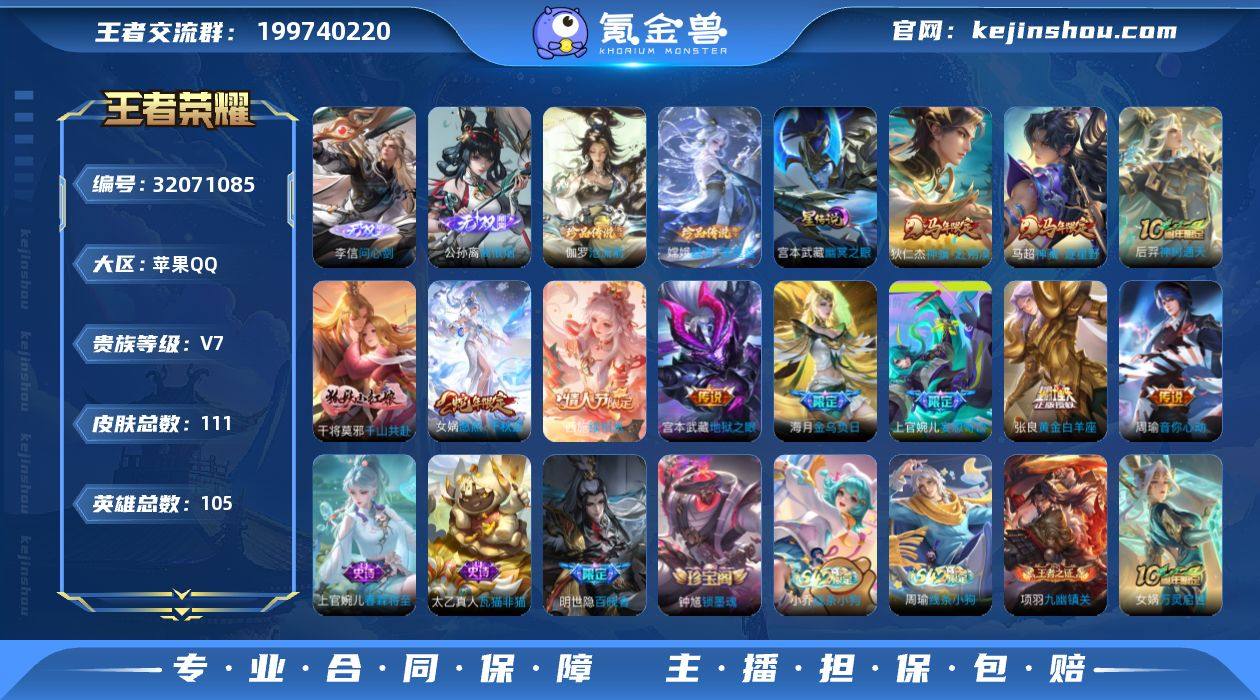 贵族等级:V7 典藏皮肤数:0 珍品无双皮肤数:0 无双皮肤数:2 珍品传说皮肤数:2 传说皮肤数:11 史诗皮肤数:34 皮肤数:111 英雄数:105 段位:荣耀王者 卖家说:中路前百分之十标 万战异星婉儿 中路四十七段