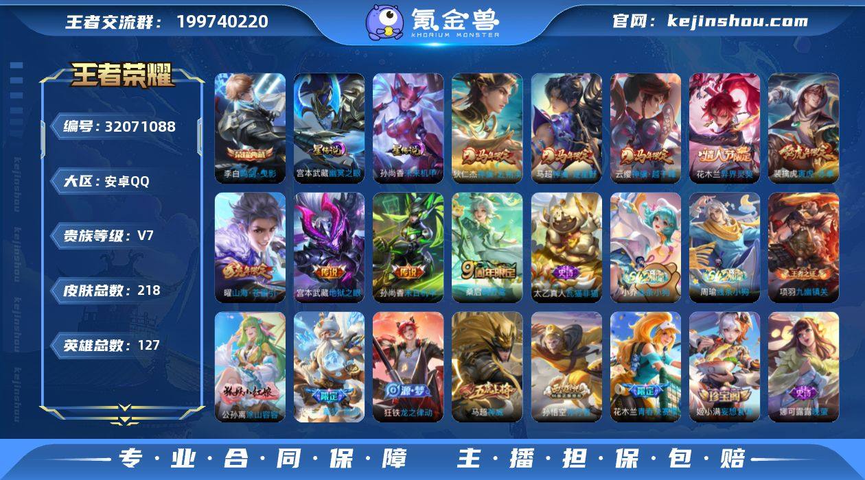 贵族等级:V7 典藏皮肤数:1 珍品无双皮肤数:0 无双皮肤数:0 珍品传说皮肤数:0 传说皮肤数:9 史诗皮肤数:70 皮肤数:218 英雄数:127 段位:非凡王者 卖家说:四省标 双万战李白元歌连体cf王者级3把63把英雄级带一英雄级角色低场次 好运卡战令已开