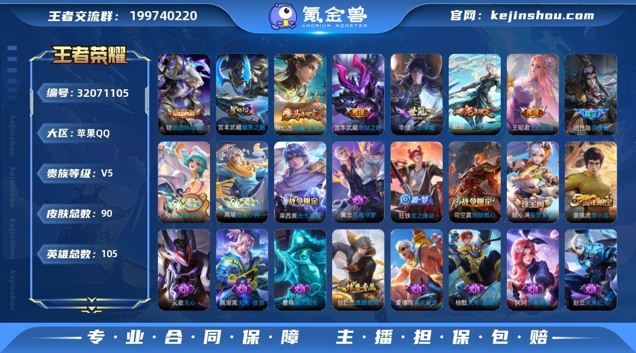 贵族等级:V5 典藏皮肤数:1 珍品无双皮肤数:0 无双皮肤数:0 珍品传说皮肤数:0 传说皮肤数:5 史诗皮肤数:24 皮肤数:90 英雄数:105 段位:非凡王者 卖家说:急出
