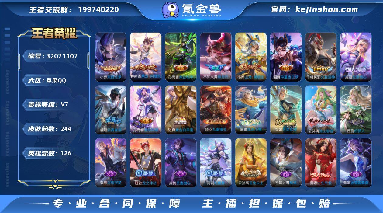 实名: 可修改 性别: 女号 贵族等级: V7 英雄数: 126 皮肤数: 244 荣耀水晶: 天鹅之梦 传说皮: 黄金白羊座,久胜战神,云霓雀翎,末日机甲-孙尚香,仲夏夜之梦,音你闪耀,山海·琳琅生,乘龙·问璇玑 限定皮: 一生所爱,玉兔公主,五谷丰年,绯月行,神器·万象笔,无限倾心-虞姬 亮点: 【优质装备】:天鹅之梦(小乔典藏),黄金白羊座,久胜战神,云霓雀翎,末日机甲-孙尚香(绿蚂蚱),仲夏夜之梦(大飞蛾),音你闪耀(rap皮),山海·琳琅生(小乔年限),涂山容容