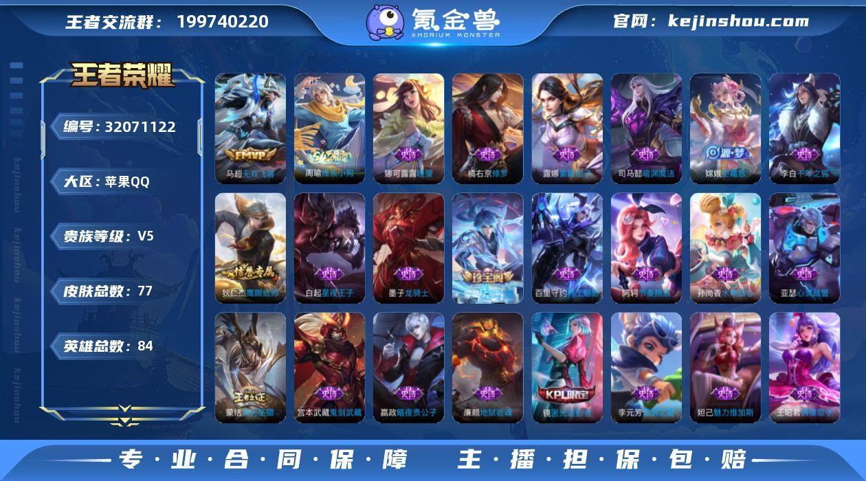 贵族等级:V5 典藏皮肤数:0 珍品无双皮肤数:0 无双皮肤数:0 珍品传说皮肤数:0 传说皮肤数:1 史诗皮肤数:23 皮肤数:77 英雄数:84 段位:黄金