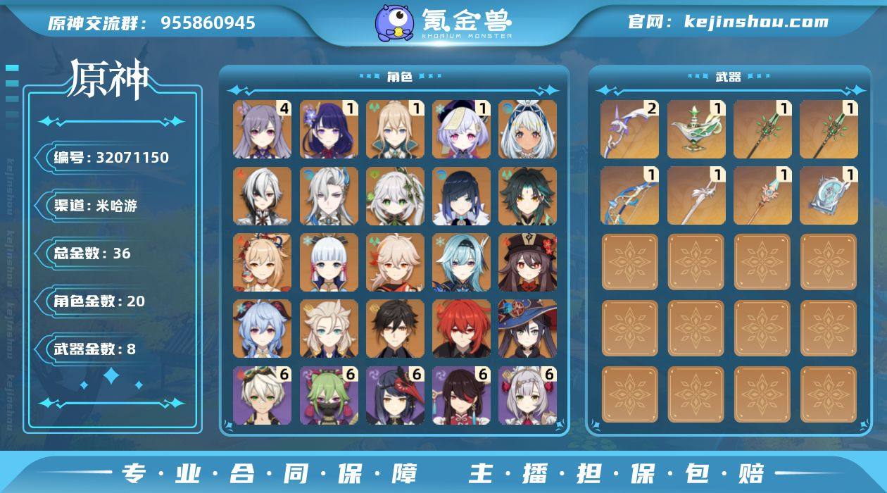 冒险等级:60 总黄数:36 5星角色数:20 5星武器数:8 原石数量:159 相遇之缘数量:0 纠缠之源数量:0 4命刻晴,1命雷电将军,1命琴,1命七七,0命玛拉妮,0命阿蕾奇诺,0命那维莱特,0命纳西妲,0命夜兰,0命魈,0命宵宫,0命神里绫华,0命枫原万叶,0命优菈,0命胡桃,0命甘雨,0命阿贝多,0命钟离,0命迪卢克,0命莫娜 6命班尼特,6命久岐忍,6命北斗,6命重云,6命多莉,6命九条裟罗,6命柯莱,6命罗莎莉亚,6命诺艾尔,6命凝光,6命托马,5命烟绯,4命卡齐娜,4命芭芭拉,4命五郎,3命嘉明,3命香菱,3命迪奥娜,3命珐露珊,3命坎蒂丝,3命辛焱,2命菲米尼,2命绮良良,2命夏沃蕾,2命菲谢尔,2命鹿野院平藏,2命瑶瑶,1命行秋,1命雷泽,1命丽莎,1命莱依拉,1命砂糖,1命云堇,1命早柚,0命叶洛亚,0命琳妮特,0命蓝砚,0命欧洛伦,0命夏洛蒂,0命伊安珊,0命伊法,0命安柏,0命凯亚,0命卡维,0命米卡 精2阿莫斯之弓,精1千夜浮梦,精1和璞鸢,精1终末嗟叹之诗,精1风鹰剑,精1天空之脊,精1四风原典 100%侦察骑士,古恩希尔德的传承,帆影游风,极夜真梦,星与月之约,雨化竹身,叶隐芳名,致教会自由人