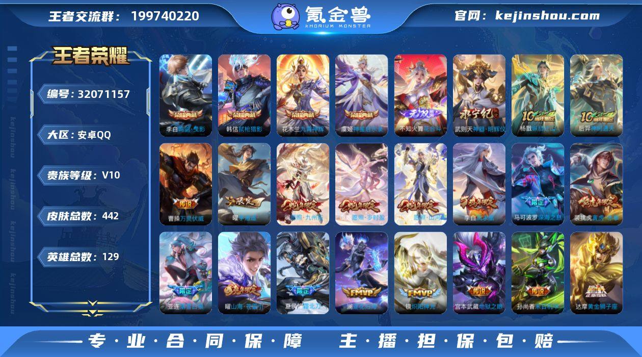 王者全皮肤号急出! 442皮肤|6荣耀典藏| 55传说,火舞+武则天无双 背包带1颗未用荣耀水晶 可二次实名,安全无风险 急用钱,诚心要直接来,价格好谈!