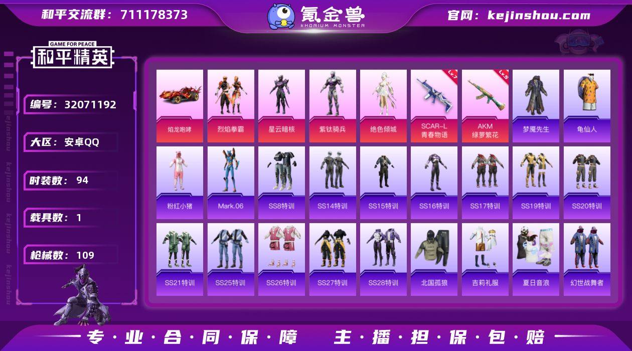 安卓 手Q-4粉装-2特效枪-1载具-2粉色飞行器-39983热力值-5王牌印记-94套装-109枪皮【热门品类】:套装-龟仙人,套装-粉红小猪,角色-Mark.06【粉色套装】:粉装-烈焰拳霸,角色-星云暗核,角色-紫钛骑兵,角色-绝色倾城【粉色枪皮等级】:AKM-绿萝繁花(五级),SCAR-L-青春物语(七级)【粉色载具】:焰龙咆哮【粉色枪皮】:AKM-绿萝繁花,SCAR-L-青春物语【粉色飞行器】:庄周梦蝶飞行器,镜域双华-灵镜之阶【粉色降落伞】:梦幻火箭降落伞,甜蜜誓约降落伞,童趣迷兔降落伞,王牌四分卫降落伞,星之彼岸降落伞,洛神天依降落伞,庄周梦蝶降落伞,炙焰牛王降落伞,垂柳戏鸭降落伞,太空嘟嘟降落伞,彩虹甜喵降落伞,莲影清波降落伞,镜光幻境降落伞,夜幕颂歌降落伞,镜域双华降落伞【稀有套装】:套装-龟仙人【稀有枪皮】:AKM-夜灯,AKM-破晓战魂,AKM-筑梦精灵,AKM-萌趣颜团子,AKM-虎虎生威,AKM-龙的传人,M16A4-幻世战舞者,M16A4-甜心亚梦,M16A4-蓝色火焰,SCAR-L-炫彩节奏,SCAR-L-玉兔迎春,SCAR-L-王牌四分卫,SCAR-L-甜蜜誓约,SCAR-L-红色方程式,M416-红色方程式,M416-蓝色火焰,GROZA-彩虹符号,GROZA-恐龙拽拽,GROZA-治愈之星,AUG-怪笑疯兔,AUG-耀粉歌者,AUG-青春冒险家,QBZ-彩虹符号,QBZ-未来歌姬,QBZ-飞驰魅影,M762-天降萌叽,Mk47-青春冒险家,AC-VAL-甜心亚梦,蜜獾-垂柳戏鸭,蜜獾-天降萌叽,蜜獾-娇憨猪猪,UZI-啾咪啾咪,UZI-天降萌叽,UZI-娇憨猪猪,UZI-炫彩节奏,UZI-红色方程式,UMP45-夜灯,UMP45-蓝色火焰,Vector-治愈之星,Vector-生命誓言,汤姆逊-炫彩节奏,汤姆逊-耀粉歌者,汤姆逊-银刃赛罗,野牛-王牌四分卫,野牛-青春冒险家,P90-飞驰魅影,Kar98K-彩虹符号,Kar98K-炫彩节奏,Kar98K-红色方程式,Kar98K-飞驰魅影,M24-治愈之星,AWM-王牌四分卫,SKS-夜灯,SKS-...