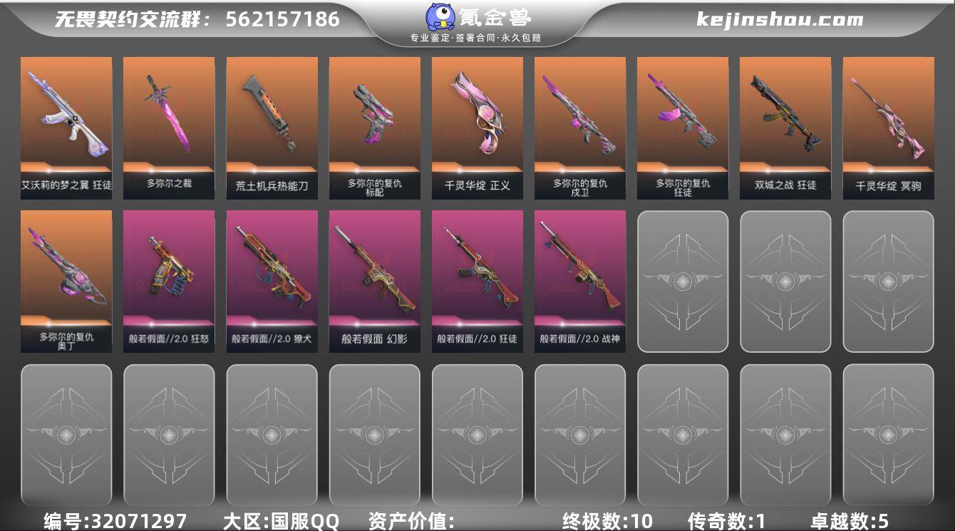 【套装】:多弥尔的复仇套装,般若假面//2.0套装【英雄】:幻棱,炼狱,维斯,暮蝶,钛狐,壹决,铁臂,捷风,雷兹,幽影,不死鸟,贤者,猎枭,蝰蛇,零,芮娜,奇乐,尚勃勒,霓虹,斯凯,夜露,星礈,K/O,海神,盖可,黑梦,钢锁【近战武器】:近战武器-多弥尔之裁,近战武器-鬼丸国纲,近战武器-荒土机兵 热能刀【狂徒】:狂徒-双城之战,狂徒-多弥尔的复仇,狂徒-艾沃莉的梦之翼,狂徒-般若假面//2.0,狂徒-荒土机兵【幻影】:幻影-般若假面,幻影-纳米打击【戍卫】:戍卫-多弥尔的复仇,戍卫-逆冲蛮牛【獠犬】:獠犬-般若假面//2.0,獠犬-逆冲蛮牛【冥驹】:冥驹-千灵华绽,冥驹-荒土机兵【战神】:战神-般若假面//2.0【奥丁】:奥丁-多弥尔的复仇,奥丁-纳米打击【判官】:判官-纳米打击x【雄鹿】:雄鹿-逆冲蛮牛【骇灵】:骇灵-荒土机兵,骇灵-无限竞技【标配】:标配-多弥尔的复仇,标配-荒土机兵【正义】:正义-千灵华绽,正义-纳米打击【鬼魅】:鬼魅-诡秘蛇影,鬼魅-宿怨,鬼魅-星云暗涌【狂怒】:狂怒-般若假面//2.0,狂怒-逆冲蛮牛【卡面】:终章:激斗汉堡 卡面,进入射程 卡面,分崩离析 卡面,纳米打击 卡面,抑制技术 卡面,激斗汉堡 卡面,瓦娃脸雪糕 P2 卡面,从黄昏到黎明 卡面,荒土机兵 卡面,银弹猎手 卡面,逆冲蛮牛 卡面,《双城之战》拥抱 卡面,精灵大战 卡面,欢迎来到底城 卡面,南瓜盛典 卡面,修车达人 卡面,正义的化身 卡面,超能偶像 卡面,Clutch 卡面,零点嗅探设计图 卡面,虹吸式咖啡壶 卡面,无畏契约GO!第一卷:芮娜 卡面,无畏契约GO!第一卷:零 卡面,代号红色 卡面,新兵报到 卡面,V契约 卡面,无畏契约 卡面【喷漆】:小小心意 喷漆,战“素”兔 喷漆,宇宙的指引 喷漆,请求重启 喷漆,逆冲蛮牛 喷漆,纳米打击 喷漆,鼻尖上的蝴蝶 喷漆,简笔画黯兽 喷漆,独守...