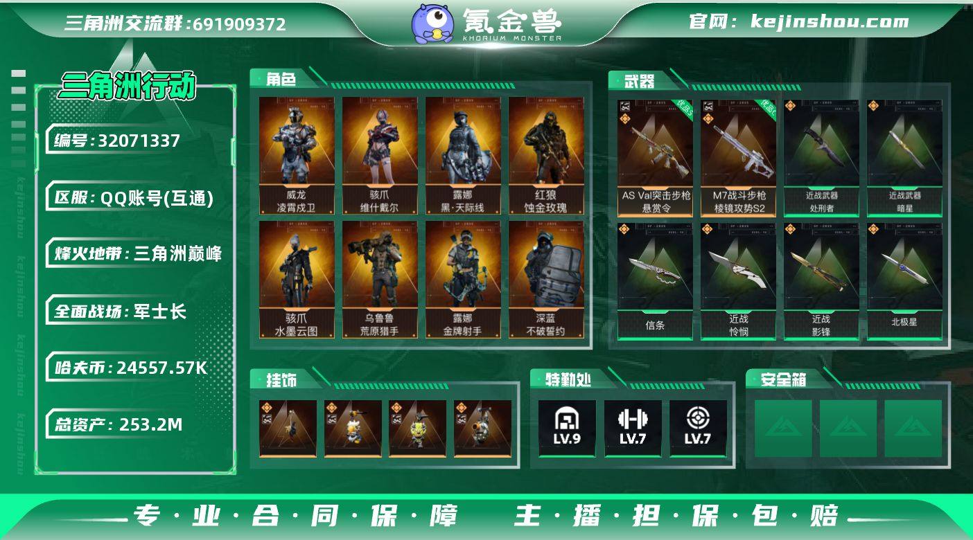实名:可二次实名 总资产:253.2M 哈夫币:24557.57K 烽火地带段位:三角洲巅峰 烽火地带等级:60 全面战场段位:军士长 全面战场等级:50 9级仓库,7级训练中心,7级靶场,6级指挥中心,1级潜水中心,3级防具台,3级工作台,3级制药台,3级技术中心,1级收藏室 战术部门等级:4 战斗部门等级:4 医疗部门等级:4 研发部门等级:3 后勤部门等级:4 曼德尔砖-气象感应:0 曼德尔砖-命运王牌:0 曼德尔砖-电玩高手:0 曼德尔砖-美杜莎:0