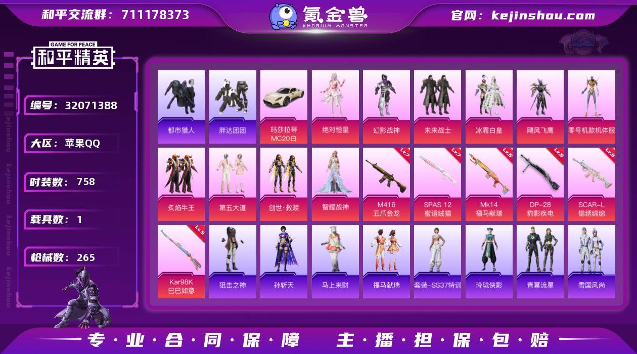 实名: 可修改 时装数: 758 载具数: 1 枪械数: 265 战备数: 195 热门装扮: 幻影战神,未来战士,鹰眼刺客,都市猎人,冰霜白皇,飓风飞鹰,零号机款机体服,炙焰牛王,胖达团团,第五大道,创世·救赎,智耀战神,绝对恒星 载具: 玛莎拉蒂MC20(星石白) 稀有枪皮: 黄金龙骨平底锅,M416五爪金龙,SCAR-L-锦绣绵绵,SPAS-12蜜语绒猫,Kar98K-巳巳如意,DP-28-豹影疾电