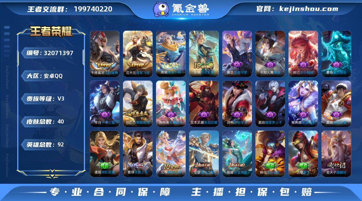 安卓Q-V3-最强王者段位-92英雄-40皮肤-3传说-13史诗【传说皮肤】:貂蝉神骥聚万邦,干将莫邪久胜战神,花木兰冠军飞将【限定皮肤】:狄仁杰阴阳师,老夫子醍醐杖,鬼谷子原初探秘者,沈梦溪龙舞盛年【赛季限定】:老夫子醍醐杖,鬼谷子原初探秘者,甄姬逆浪荇歌,亚瑟荣光之誓【战令限定】:周瑜线条小狗【史诗皮肤】:周瑜线条小狗,女娲万灵启世,黄忠百相守梦,不知火舞魅语,狄仁杰鹰眼统帅,雅典娜冰冠公主,李白千年之狐,曹操幽灵船长,吕布圣诞狂欢,妲己女仆咖啡,嬴政摇滚巨星,嬴政暗夜贵公子,孙尚香水果甜心,宫本武藏鬼剑武藏【其他皮肤】:虞姬溯影追猎,曹操逐霄之志,艾琳鹤鸣心笺,亚瑟荣光之誓,甄姬逆浪荇歌,沈梦溪龙舞盛年,鬼谷子原初探秘者,老夫子醍醐杖,王昭君幻想奇妙夜,狄仁杰阴阳师,后羿阿尔法小队,花木兰兔女郎,达摩拳王,亚瑟死亡骑士,宫本武藏未来纪元,程咬金星际陆战队,韩信街头霸王,猪八戒年年有余,上官婉儿修竹墨客,关羽天启骑士,李元芳特种部队,貂蝉异域舞娘,高渐离金属狂潮【营地ID】:1660761557