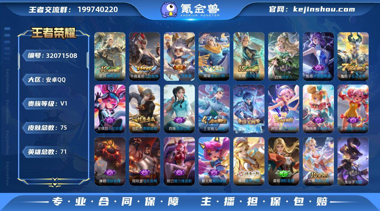 安卓Q-V0-永恒钻石V段位-71英雄-75皮肤-1典藏皮肤-3传说-17史诗【荣耀典藏】:安琪拉颠倒童话魔镜【传说皮肤】:后羿神树通天,李元芳飞鸢探春,干将莫邪久胜战神【限定皮肤】:大乔绒语心约,狄仁杰阴阳师,李元芳云中旅人,鬼谷子五谷丰年,裴擒虎擒涛扼浪,上官婉儿梁祝,鲁班大师探海日志,桑启海盐诗旅,阿古朵江河有灵,张良古海寻踪,鬼谷子天穹祈灯,刘邦剑破天穹,周瑜熔金海岸【赛季限定】:李元芳云中旅人,桑启海盐诗旅,裴擒虎擒涛扼浪,鲁班大师探海日志,张良古海寻踪,鬼谷子天穹祈灯,刘邦剑破天穹【战令限定】:周瑜线条小狗【史诗皮肤】:太乙真人瓦猫非猫,周瑜线条小狗,女娲万灵启世,西施织梦人,弈星万物之道,阿古朵江河有灵,鬼谷子五谷丰年,西施诗语江南,上官婉儿梁祝,狄仁杰鹰眼统帅,程咬金功夫厨神,蔡文姬舞动绿茵,安琪拉心灵骇客,小乔缤纷独角兽,妲己魅力维加斯,孙尚香水果甜心,廉颇地狱岩魂,甄姬冰雪圆舞曲【其他皮肤】:桑启线条小狗,虞姬溯影追猎,艾琳鹤鸣心笺,鬼谷子克喵,莱西奥踏浪烽翎,张良灵野札记,少司缘灵卦秘语,西施雪境奇遇,大乔绒语心约,周瑜熔金海岸,刘邦剑破天穹,朵莉亚金色潮汐,鬼谷子天穹祈灯,后羿完美运算,张良古海寻踪,李元芳妄想特派,鲁班大师探海日志,太乙真人劲辣红锅,裴擒虎擒涛扼浪,桑启海盐诗旅,李元芳云中旅人,鲁班大师乓乓大师,小乔丁香结,大乔守护之力,鬼谷子幻乐之宴,李元芳黑猫爱糖果,狄仁杰阴阳师,花木兰兔女郎,亚瑟死亡骑士,妲己少女阿狸,安琪拉玩偶对对碰,白起白色死神,芈月红桃皇后,桑启画中游,西施归虚梦演,瑶森,盘古创世神祝,李信灼热之刃,米莱狄精准探案法,弈星踏雪寻梅,杨玉环霓裳曲,公孙离花间舞,明世隐占星师,女娲尼罗河女神,东皇太一东海龙王,大乔伊势巫女,苍维京掠夺者,蔡文...