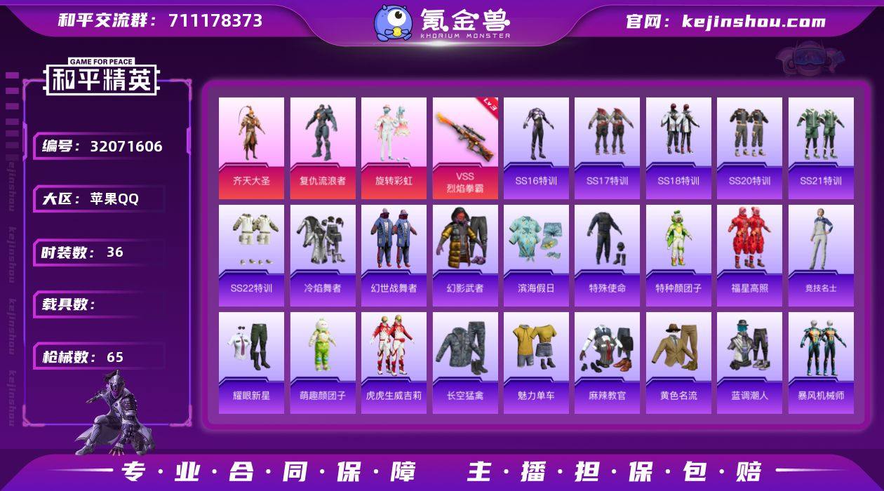 苹果 手Q-3粉装-1特效枪-0载具-1粉色飞行器-18411热力值-1王牌印记-36套装-65枪皮【粉色套装】:粉装-齐天大圣,角色-复仇流浪者,粉装-旋转彩虹【粉色枪皮等级】:VSS-烈焰拳霸(三级)【粉色枪皮】:VSS-烈焰拳霸【粉色飞行器】:天之羽翼飞行器【粉色降落伞】:幻影战神降落伞,四圣焕新降落伞,齐天大圣降落伞,洛神天依降落伞,千面幻镜降落伞【稀有枪皮】:AKM-破晓战魂,AKM-萌趣颜团子,AKM-虎虎生威,M16A4-幻世战舞者,M16A4-红色方程式,SCAR-L-红色方程式,SCAR-L-龙宫之主,M416-红色方程式,M416-蓝色火焰,GROZA-异彩先驱,GROZA-黑色刀锋,AUG-耀粉歌者,M762-烈焰拳霸,M762-瑞龙福将,G36C-时空追击者,AC-VAL-天降萌叽,UZI-红色方程式,UMP45-时空追击者,汤姆逊-异彩先驱,汤姆逊-林间仙鹿,汤姆逊-炫彩节奏,汤姆逊-耀粉歌者,野牛-夜灯,野牛-电玩视界,MP5K-异彩先驱,P90-闪光银龙,Kar98K-红色方程式,M24-众神之王,AWM-不夜海上花,SKS-时空追击者,SKS-炫彩节奏,SKS-焦糖拿铁,Mini14-异彩先驱,Mini14-耀粉歌者,Win94-瑞龙福将,QBU-烈焰拳霸,MK20-H-墨染幽兰,S686-王牌投手,S686-红色方程式,S1897-炫彩节奏,S12K-瑞龙福将,S12K-破晓战魂,DBS-彩虹甜喵,DBS-时空追击者,SPAS-12-太空嘟嘟,M249-月影鸳鸯,M249-破晓战魂,DP-28-齐天大圣,MG3-幻世战舞者,MG3-瑞龙福将,P92-红伞翩翩,沙漠之鹰-旋转彩虹【其他套装】:套装-SS16特训,套装-SS17特训,套装-SS18特训,套装-SS20特训,套装-SS21特训,套装-SS22特训,套装-冷焰舞者,套装-幻世战舞者,套装-幻影武者,套装-滨海假日,套装-特殊使命,套装-特种颜团子,套装-福星高照,套装-竞技名士,套装-耀眼新星,套装-萌趣颜团子,套装-虎虎生威吉莉,套装-长空猛禽,套装-魅力单车,套装-麻辣教官,套装-黄色名流,套装...