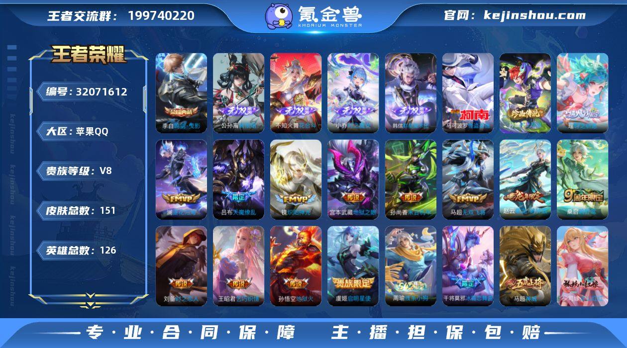 贵族等级:V8 典藏皮肤数:1 珍品无双皮肤数:0 无双皮肤数:4 珍品传说皮肤数:2 传说皮肤数:13 史诗皮肤数:56 皮肤数:151 英雄数:126 段位:钻石