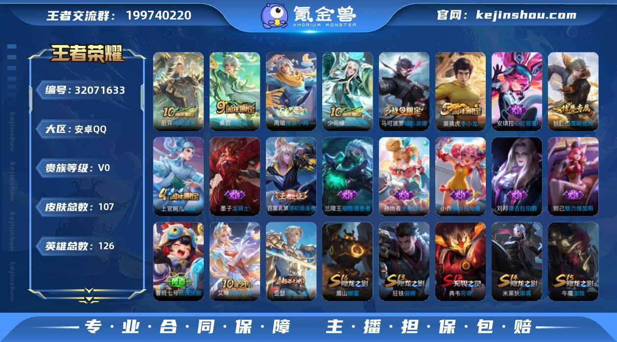 贵族等级:V0 典藏皮肤数:0 珍品无双皮肤数:0 无双皮肤数:0 珍品传说皮肤数:0 传说皮肤数:2 史诗皮肤数:13 皮肤数:107 英雄数:126 段位:星耀