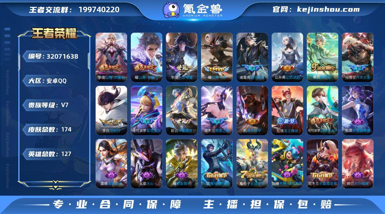 【王者荣耀】珍品无双0 典藏0 无双0 珍品传说0 传说16 史诗40 英雄127 皮肤174 贵族5级 传说皮肤:鸣野蒿|绛天战甲|刘备-时之恋人|一念神魔|云鹰飞将|淬星耀世|鹤羽星尊|记忆之芯|齐天大圣|燃星之曲|诗剑行|妄想实况|战鼓燎原|逐花归海|山海·苍雷引|山海·炽霜斩__稀有限定:山海·玄木吟|百里守约-真我赫兹|大漠名商|高山流水|古海寻踪|海滩派对|海盐诗旅|皇家上将|剑破天穹|江河有灵|魔术师|奇幻香踪|擒涛扼浪|青焰无极|探海日志|天穹祈灯|无心|五谷丰年|星界游侠|阴阳师|驭风魔法|暗隐猎兽者|冰冠公主|冰雪圆舞曲|乘风破浪|德古拉伯爵|电玩·爆裂旋风|鬼剑武藏|唤灵魅影|节奏热浪|金属风暴|吕布-末日机甲|魅力维加斯|女仆咖啡|偶像歌手|赏金猎手|圣诞狂欢|水果甜心|水晶猎龙者|天才门将|星夜王子|鹰眼统帅|幽灵船长|紫霞仙子|百里守约-百相守梦|老夫子-百相守梦|噬灭天穹|蔡文姬-夏日便利店|虞姬-夏日便利店|天穹之誓|曙光守护者|千年之狐|谧流熔炉|云中旅人|玲珑珍味|暖冬·兔眠|苍威无极|龙之律动|布丁狗之约|虚灵犬护|周瑜-线条小狗__优质皮肤:创世神祝|孤猎|激情绿茵|海之征途|碧珀绯影|秩序猎龙将|冰刃幻境|超能战警|英喵野望|踏雪寻梅|启蛰|战争骑士|画中游|威尼斯狂欢|第七人偶|芝加哥教父|绝影神枪|幸存者|赤焰之缨|福禄兄弟|隐刃|前尘|特种部队|三太子|精灵王|范海辛|星航指挥官|龙域领主|占星师|花间舞|花见巫女|棒球奇才|灼热之刃|帝国元帅|异域舞娘|万圣前夜|绒语心约|功夫炙烤|聚星闪耀|潮玩探月行|秘密基地|次元突破|鲨炮海盗猫|虹云星官|海滩丽影|阿尔法小队|兔女郎|死亡骑士|黄金武士|少女阿狸|玩偶对对碰|宫本武藏-未来纪元|红桃皇后|忍·炎影|街头霸王|教廷特使|破局者|太极少年|危途狂花|白色死神|白执事|星梦巡礼|景韶洛都|浪漫序章|缤纷绘卷|掌控之力|雾都夜雨|逐霄战戟|纽约教父|龙腾万里|敏锐...