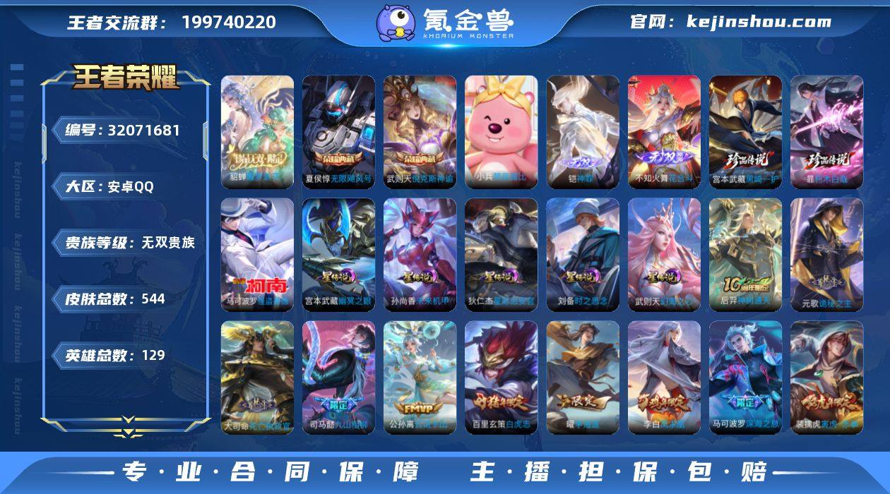 【无双V10 544皮肤1珍品无双2无双3珍品3典藏80传说6星元3天幕 秒换绑不用等】安卓Q-129英雄【3水晶】武则天倪克斯神谕 无限飓风号【1珍品无双】馥梦繁花【2无双】神罪 花合斗【6星元】 星际治安官 未来机甲 幻海之心 幽冥之眼 时之思念【3珍品传说】黑崎一护 朽木白哉 怪盗基德【80传说】神树通天 云诺千山 白虎志 李逍遥 死亡执政官 诡秘之主 九山相柳 曦玄引 电玩·雷克斯 金乌负日 遇见神鼓 百相守梦 黄金天蝎座 至美·化雀舞 小动物乐团 霜月吟 觅芳踪 逐花归海 琥珀纪元 鸣野蒿 惊梅引 霜北刀 冥王哈迪斯 启示之音 云鹰飞将 牧神诗旅 灼幽烈阳 记忆之芯 画中仙 诗剑行 碎云 枫霜尽 前尘镜 音你闪耀 深海之息 无尽星芒 无双飞将 挚爱之约 花朝如约 黄金狮子座 超时空战士 仲夏夜之梦 猫影幻舞 太华 久胜战神 地狱之眼 武圣 黄金射手座 冠军飞将 炽阳神光 绛天战甲 凤求凰 一念神魔 飞鸢探春 时之恋人 胖达荣荣 寅虎·赤拳 末日机甲 地狱火 零号·赤焰 乞巧织情 海洋之心 游龙清影 音你心动 永曜之星 云霓雀翎 启明星使 黄金白羊座 淬星耀世 武陵仙君 怒海麟威 乘龙·铭钟鼎 幻光神枪 祥瑞亨通 天魔缭乱 战鼓燎原 落雪白狼【187史诗】冰锋战神 神威 鸭鸭历险记 九幽镇关 守夜人 梅西 巫礼祀神 万灵启世 罗小黑战记 光弋星穹 傩神司 至尊宝 龙之律动 琥珀纪元 至美·乘鲤谣 谪仙醉月 星界战将 怒海争锋 浮光幕影 燃音魔法 江河有灵 妄想食味 地狱燃心 天穹祈灯 天穹之誓 逐霄战戟 赞萌露比 小牛鸭 石田雨龙 灵蛊蚀心 百相守梦 逆浪荇歌 破空之剑 撼地雄心 飞车小橘子 幻珠鲛人 奇幻香踪 完美假期 织梦人 顽趣 星界游侠 真我赫兹 涂山容容 末日机甲 驭风魔法 蔬乡物语 青焰无极 夜落电台 闲日渔趣 完美运算 百解令 魔法小厨娘 魅语 舞动绿茵 奇迹圣诞 幽灵船长 天狼征服者 繁星吟游 如梦令 拒霜思 功夫厨神 女仆咖啡 魅...