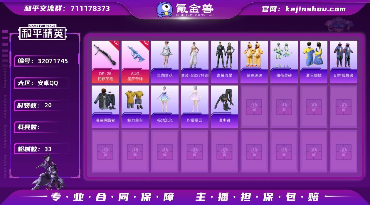 可二次实名【AUG星梦奇缘4特效枪 秒换绑不用等】 安卓Q区-8966热力值-20套装-33枪皮 【4特效枪】 AUG-星梦奇缘(3级) Mk14-福马献瑞(5级) UMP45-萌骑冒险(2级) DP-28-豹影疾电(2级)【41热门】 MG3-幻世战舞者 夏日倾情 魅力单车 漫步者 海岛探路者 AA12-G-雨过天青 沙漠之鹰-雨过天青 M16A4-雨过天青 雨过天青 MG-36-薄荷星砂 GROZA-福马献瑞 福马献瑞 燃点复合弓-罪夜之冕 ACE32-冰晶雪宝 青翼流星 蝎式手枪-虹云熊熊 MG3-火熔核心 魂电 幸运青 莫辛纳甘-辉光之愿 蜜獾-启元战纹 马上有钱 Mk47-虹云熊熊 MK20-H-星梦奇缘 狙击之神 幽雨猫猫 暖阳柴柴 极地流光 粉雾星云 汤姆逊-星梦奇缘 AKM-霓彩脉冲 破片手榴弹-拽到爆炸 Famas-霓彩脉冲 SVD-霓彩脉冲 铝热弹-炫彩糖果 电击枪-喜羊羊与灰太狼 萌鸡速递 SS37特训 AMR-雨过天青 PKM-雨过天青 红釉青花【1飞行器】 辉光之愿飞行器【3背包】 星梦奇缘背包(3级) 甜蜜菠萝背包(3级) 萌鸡速递背包(3级) 营地ID:1036071368